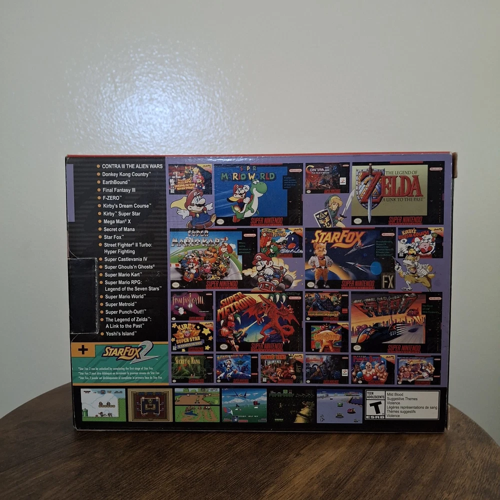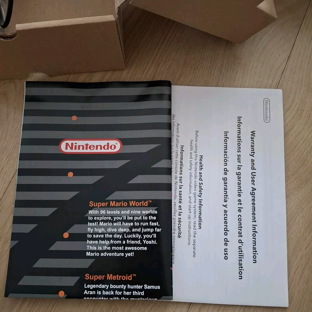 Nintendo Super NES Console - Classic Edition - Complete In Box. This home console by Nintendo is region-free and comes in a classic gray color. It includes HDMI connectivity and has a storage capacity of 512MB. The model is the Nintendo Super NES Classic Edition. This console is barely used and is in excellent condition.