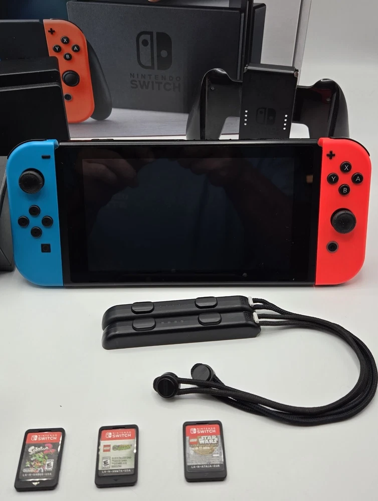 Nintendo Switch 32GB Neon Red & Blue Joy-Con Bundle HAC-001 W/ 3 Games. Nice!