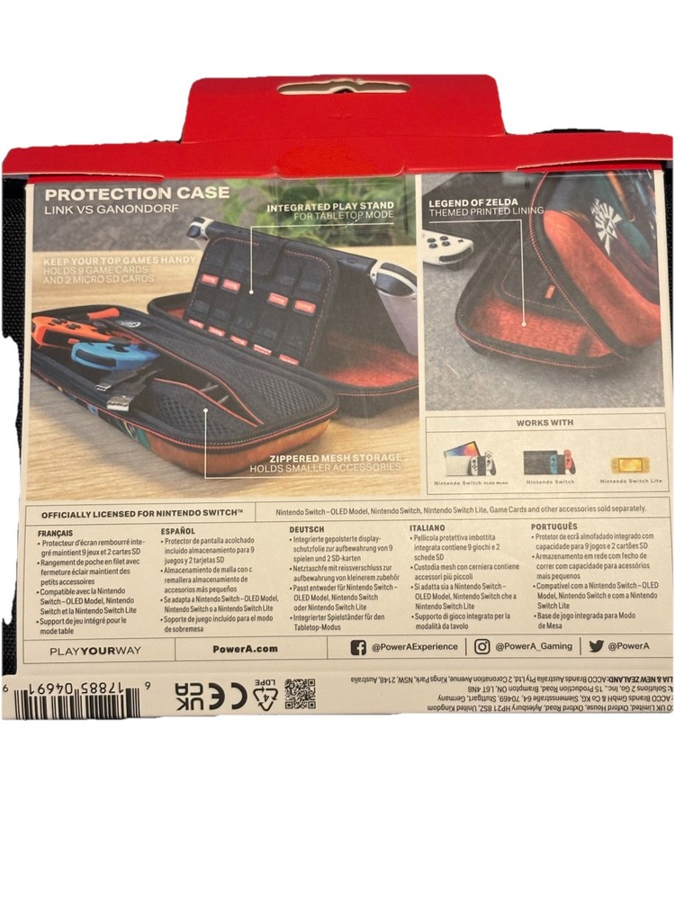 PowerA Protection Case for Nintendo Switch OLED – The Legend of Zelda Edition Official Licensed Christmas Gift Item Details: • Brand: PowerA • Model: Protection Case – The Legend of Zelda Edition • Compatible With: Nintendo Switch – OLED model • Officially Licensed by Nintendo • Condition: Brand New • Design: The Legend of Zelda theme • Storage: Holds up to 10 game cards • Features: • Durable hard-shell exterior for superior protection • Soft, padded interior with built-in screen protector flap • Secure zippered closure • Convenient carrying handle for travel