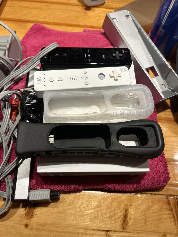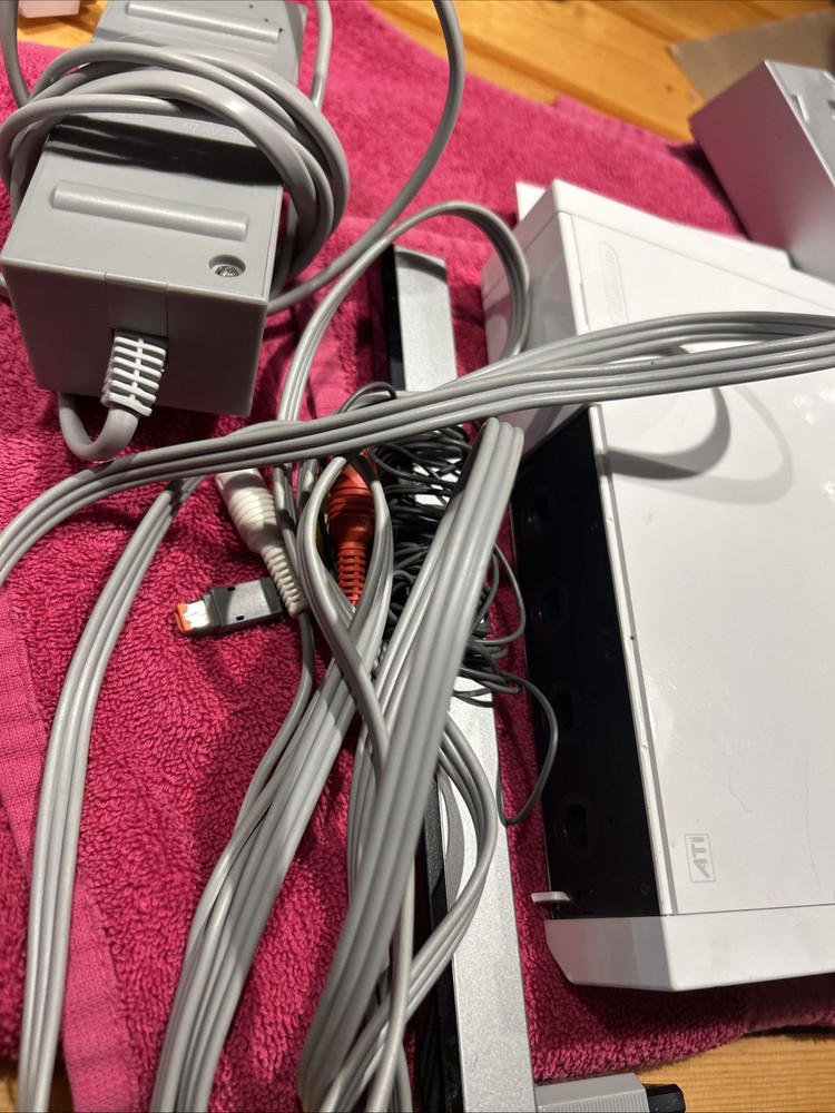 Nintendo WII Launch version. Includes console, power cord, av cords, sensor bar, 2 Wii mote and 2 nun chuck. One motion plus accessory. 1 classic controller. GameCube controller port cover is broken. Tested to work.