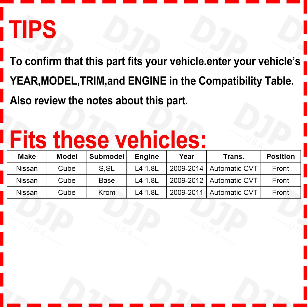 Front LH & RH Pair CV Axle Shaft for Nissan Cube S SL Auto CVT Trans 2009-2014 Product Description: 【OE Number】 NCV53907 (Front Left), NCV53908 ( Front Right); Front Driver Passenger Side 【Fitment】 For 2009 10 11 12 13 2014 Nissan Cube 1.8L FWD w/Automatic CVT Transmission 【Reference Number】 TN-13233, TN-13234 , 66-6253, 66-6250, 39100ED805,39100EM40C,39101ED805,39101EM40C 【Product Advantages】Premium grade neoprene boots provide protection against dirt and debris in driving conditions; Specially formulated moly grease for optimal performance at high temperatures; High-quality stainless-steel clamps for heavy duty strength and durability. 【Easy Installation】Brand-New; Arrives fully assembled; Threads & splines are precision rolled for hassle-free direct replacement; ISO/TS16949 certified, tested to the strictest OE standards, also improved those traditional design weaknesses, to ensure vehicle fitment and product reliability. Axle Specification: OE Number: NCV53907 , Front Driver Side OE Number: NCV53908 , Front Passenger Side Compressed Length: 25.16 (IN), 639mm Compressed Length: 36.06 (IN), 916mm ABS Tone Ring Included: No ABS Tone Ring Included: No Inboard Joint Type: Male Inboard Joint Type: Male Inboard Spline Quantity: 25 Inboard Spline Quantity: 25 Outboard Joint Type: Conventional Outboard Joint Type: Conventional Outboard Spline Quantity: 25 Outboard Spline Quantity: 25 TIPS: If you are purchasing a combination product, there are two main situations that cause your package to be spt .Thanks for your understanding. 1. the items are overweight or oversize when they are packed together. 2. We have wareshouses in different states. sometimes the items have to be shipped separatetly based on our stock quantity and order destinations. There are tracking numbers for each parcel, but only one tracking number can be uploaded for every order due to eBay regulation. Therefore, when you don't get your order completely, please don't worry, pls contact me first by eBay message. We will check the situation and respond to you as soon as possible. Multiple items will be separated dispatch to prevent damage during the transit, please understand. Shipping We have several warehouses in United States to make the delivery. We ship the items based on distance and inventory in our warehouses.Your order might be shipped from different cities. There are limits on weight or size for each parcel. When the items are overweight, we will ship them separately in different parcels. However, only one tracking number can be updated to the order. Please contact us if you don't get your order completely and we will check the reason and respond as soon as possible. We do not ship to APO,FPO,AK,HI,PR,VI,GU or international countries. All orders will be dispatched within 3 business days and the estimated delivery time is 3-8 business days. Payment We accept payment from eBay Checkout System only , you could pay with Paypal, Master Card, Credit Card and so on. Please make payment within 7 days after committing to buy. If you want to cancel the order, please feel free to contact us within our handling time, thanks! Return We accept all return within 30 days after Buyer receive the parcel. The shipping cost shall be paid by Buyer, except defective items or wrongly sent goods. The returned items must be new and in original package. any item in poor condition will not be credited. If you any troubles, please feel free to contact us. We will try best to help you out. Please do no leave any negative or neutral feedback before letting us know, thanks! About us Your satisfaction is our top priority. We stand behind all products we sell. If you have any problems about our products, please contact us through eBay Message. We will get back to you within 24 hours in our working time. Our working time is from Monday to Friday. Please allow us a longer response time at weekends and holidays, thanks for your great consideratio Front LH & RH Pair CV Axle Shaft for Nissan Cube S SL Auto CVT Trans 2009-2014 Product Description: 【OE Number】 NCV53907 (Front Left), NCV53908 ( Front Right); Front Driver Passenger Side 【Fitment】 For 2009 10 11 12 13 2014 Nissan Cube 1.8L FWD w/Automatic CVT Transmission 【Reference Number】 TN-13233, TN-13234 , 66-6253, 66-6250, 39100ED805,39100EM40C,39101ED805,39101EM40C 【Product Advantages】Premium grade neoprene boots provide protection against dirt and debris in driving conditions; Specially formulated moly grease for optimal performance at high temperatures; High-quality stainless-steel clamps for heavy duty strength and durability. 【Easy Installation】Brand-New; Arrives fully assembled; Threads & splines are precision rolled for hassle-free direct replacement; ISO/TS16949 certified, tested to the strictest OE standards, also improved those traditional design weaknesses, to ensure vehicle fitment and product reliability. Axle Specification: OE Number: NCV53907 , Front Driver Side OE Number: NCV53908 , Front Passenger Side Compressed Length: 25.16 (IN), 639mm Compressed Length: 36.06 (IN), 916mm ABS Tone Ring Included: No ABS Tone Ring Included: No Inboard Joint Type: Male Inboard Joint Type: Male Inboard Spline Quantity: 25 Inboard Spline Quantity: 25 Outboard Joint Type: Conventional Outboard Joint Type: Conventional Outboard Spline Quantity: 25 Outboard Spline Quantity: 25 TIPS: If you are purchasing a combination product, there are two main situations that cause your package to be spt .Thanks for your understanding. 1. the items are overweight or oversize when they are packed together. 2. We have wareshouses in different states. sometimes the items have to be shipped separatetly based on our stock quantity and order destinations. There are tracking numbers for each parcel, but only one tracking number can be uploaded for every order due to eBay regulation. Therefore, when you don't get your order completely, please don't worry, pls contact me first by eBay message. 