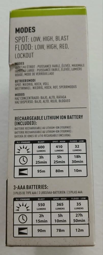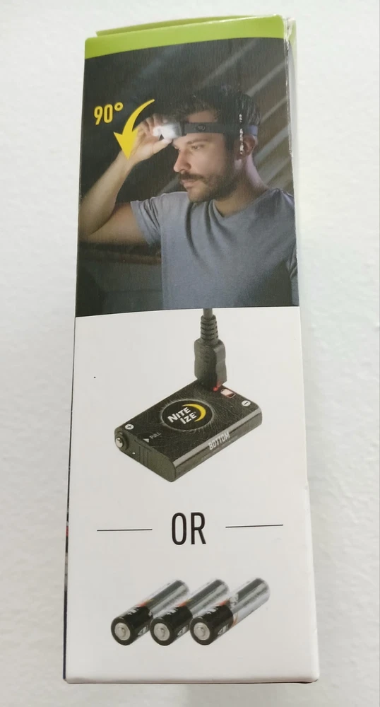 Brand new, factory sealed. Ships quickly to you by the next business day. Radiant RH1 PowerSwitch Rechargeable Headlamp combines first-in-class LED technology with lightweight portability, creating the ultimate all-purpose headlamp. Featuring spot and flood beams with independent dual-button control, you can select flood modes for soft area lighting, spot modes to shine a focused work light, blast mode for a combination of the two, or red mode to preserve night vision. Fueled by PowerSwitch technology, RH1 runs on its included rechargeable, removable battery pack or with 3-AAA alkaline batteries (not included). Weatherproof and drop-tested up to 1 meter, the durable body tilts up to 90° and casts a 95-meter beam, running up to 18.5 hours on low. Designed for hobbies, professions, emergencies, and adventures, this headlamp recharges in 3.5 hours via micro USB cable (not included) and features lockout mode to prevent accidental battery drain. PRODUCT DETAILS 600 lumens Six modes (plus lockout): Spot: low, high, blast Flood: low, high, red Blast mode combines high spot + high flood beams Red mode illuminates while preserving night vision Headlamp turns on on in low mode for easy eye adaptation PowerSwitch dual-power source: runs on included rechargeable Lithium Ion battery or 3-AAA alkaline batteries (not included) Water resistant (IPX4) Impact resistant (drop proof to 1 meter) Textured dual-button design allows independent operation of spot and flood modes Headlamp body tilts 90° for easy beam adjustment Lightweight body weighs only 82g (2.89oz) Comfortable, high-quality adjustable strap is removable + reflective Red mode is activated by pressing and holding flood button for 2 seconds Lockout mode is activated/deactivated by pressing and holding either button for 5 seconds Removable battery pack recharges in approximately 3.5 hours using micro USB cable (not included) Indicator light turns from red to green when fully charged