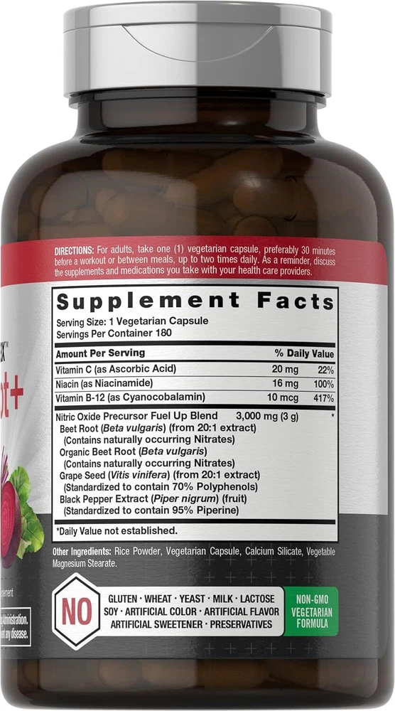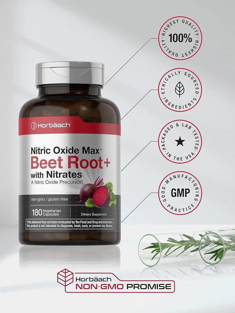 About this item BEET ROOT: Harness the goodness of this superfood with convenient capsules VEGETARIAN FORMULA: Beet Root, Black Pepper Extract and more in a Nitric Oxide Precursor Blend* EXPERTLY CRAFTED: Our professional formula is backed by our commitment to purity and potency HORBAACH MANUFACTURERS: Laboratory Tested, Trusted Ingredients, Superior Quality, 100% Guaranteed! FREE OF: Gluten, Wheat, Yeast, Milk, Lactose, Soy, Artificial Flavor, Sweetener & Non-GMO