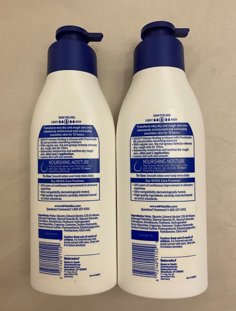 Nivea Body Lotion Intense Healing 72 Hr w/ Deep Nourishing Serum Pack of 2 Size: 16.9 fl oz Brand New, Sealed Shipped with USPS Ground Advantage Accept Return within 30 days as long as item is in the same condition as it was shipped. Buyer Pays Return Shipping. Thank You for your Business and Have a Nice Day!