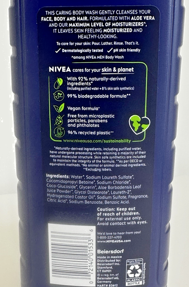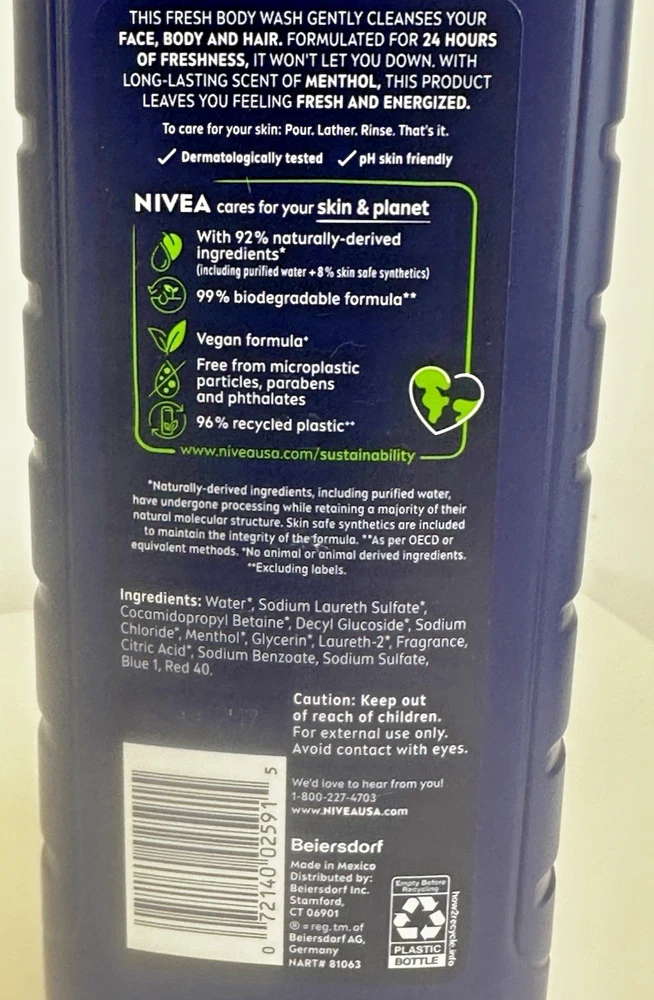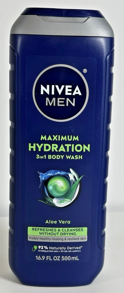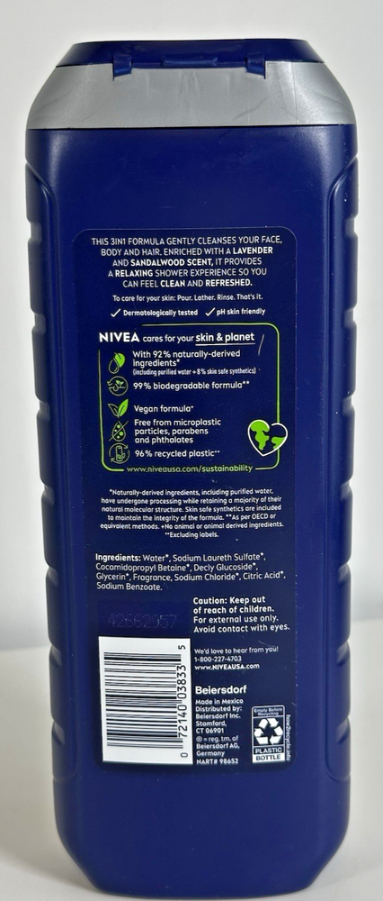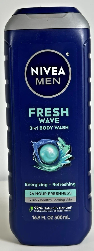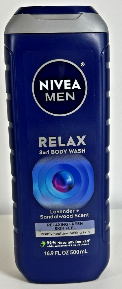 For sale new body wash lot of three made by Beiersdorf in Mexico for the Nivea Men product line. These bottles of body wash contain 16.9 fluid ounces each and are made with 92% naturally-derived ingredients. These are vegan formulas and are 99% biodegradable. Details below. DETAILS Nivea Men Relax 3in1 Body Wash Lavender + Sandalwood Scent 16.9 fluid ounces Nivea Men Maximum Hydration 3in1 Body Wash Aloe Vera Scent 16.9 fluid ounces Nivea Men Fresh Wave 3in1 Body Wash Menthol Scent 16.9 fluid ounces