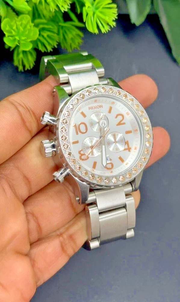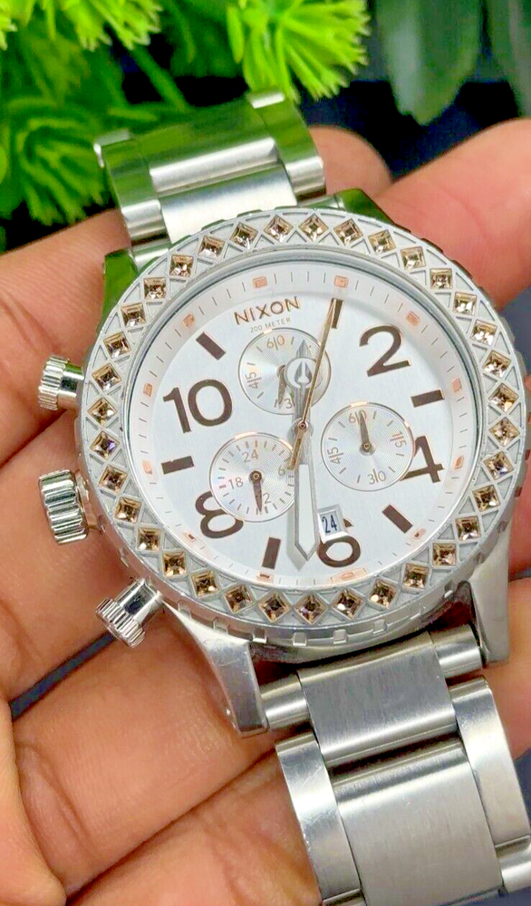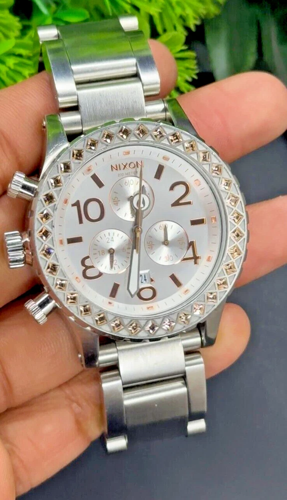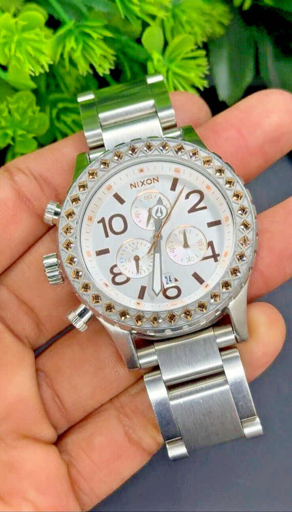 The Nixon 42-20 Chrono watch features a luxurious design with a silver stainless steel band and a red gold and silver case color combination. The white dial complements the overall sporty yet elegant look, suitable for both casual and formal occasions. This unisex quartz wristwatch boasts water resistance, a chronometer, date indicator, and a rotating bezel, catering to those who value functionality and style in their timepiece. With a 42mm case size and analog display, the Nixon 42-20 offers a versatile and reliable accessory for daily wear.