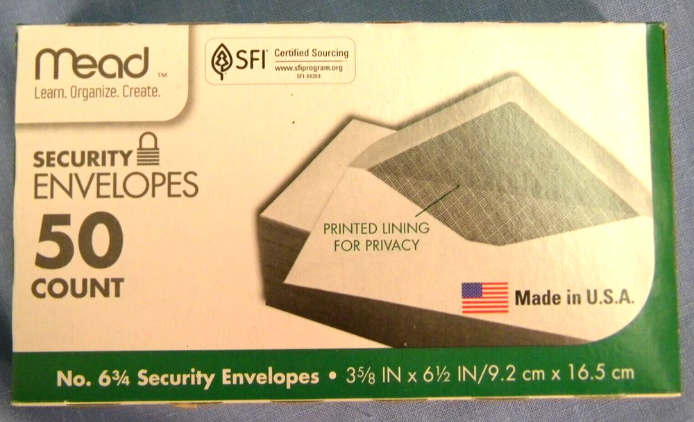 No # 6-3/4 Check Size White Security Envelopes Made in USA by Mead Box of 50 Genuine high quality Mead Brand - Made in USA Highest quality 20 lb. White Wove Inside security tinted for no see through Standard number 6-3/4 size check size personal envelope 3-5/8 x 6-1/ inch size, 9.2 x 16.5 cm Box of 50 envelopes Tab re-close box Shipping charge by USPS is actual based on weight and your location As with ALL of our listings – we offer a 14-day or longer money back guarantee for items returned in the same condition . Our business depends on customer satisfaction. Browse our store “Yard Barn Estates” Where you will find an array of NEW and VINTAGE items, tools, writing instruments, office supplies, collector toys, CD's, music, historical magazines, coins & currency, collector books, artwork, collector cameras, and other unique items from recent estate and business liquidations. Visit often. Our inventory changes daily. Sign up for my email newsletters by adding my eBay Store to your Favorites Shipping and Handling Charges : For every item, we offer the most economical yet practical and safe method of shipment. We prefer to ship by USPS Priority Mail. It is fast, economical and includes tracking and guaranteed safe delivery. Media Mail and Parcel Post shipments often take 1-2 weeks in the postal system. On some items, more than one shipping method is offered. At checkout, be sure to choose the shipping method and cost that is right for you and carefully consider how long you can wait for your purchase to arrive. We normally ship every day and usually are able to ship items the same day or next day after receiving confirmed payment. For Non-US buyers : Please make sure this item can be legally shipped to your country before bidding. We ship most items worldwide. For your protection and US Postal requirements, your telephone number is required at checkout for all shipments outside the United States. International buyers , please note: Import duties, taxes, and charges (typically collected upon delivery or pickup) are the buyer’s responsibility and are not included in the item price or shipping charges. Please check with your country's customs office prior to bidding/buying to determine what these additional costs might be. We cannot be responsible for delays in customs. We are happy to offer shipping discounts on multiple items whenever possible. Many of our items have built-in shipping discounts for multiple purchases. Because our merchandise varies in size and weight, please contact us for a shipping price on multiple items if a specific discount is not stated in the listing.