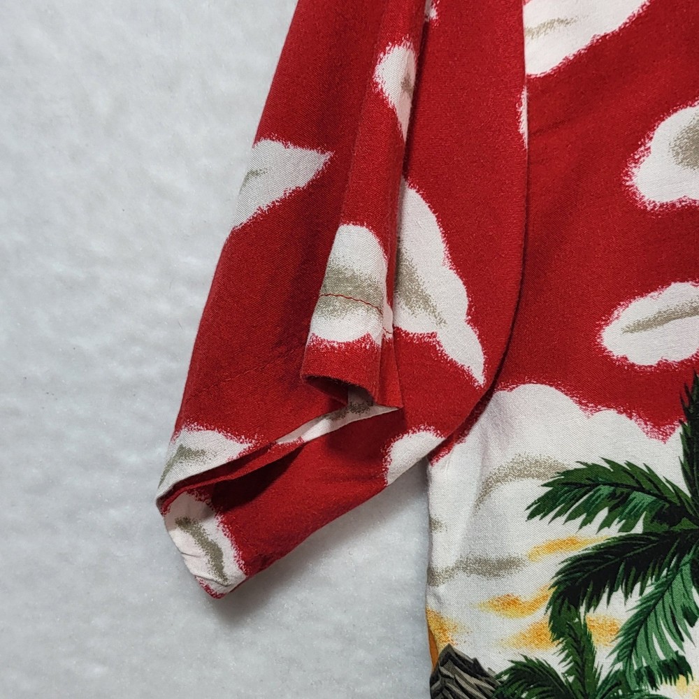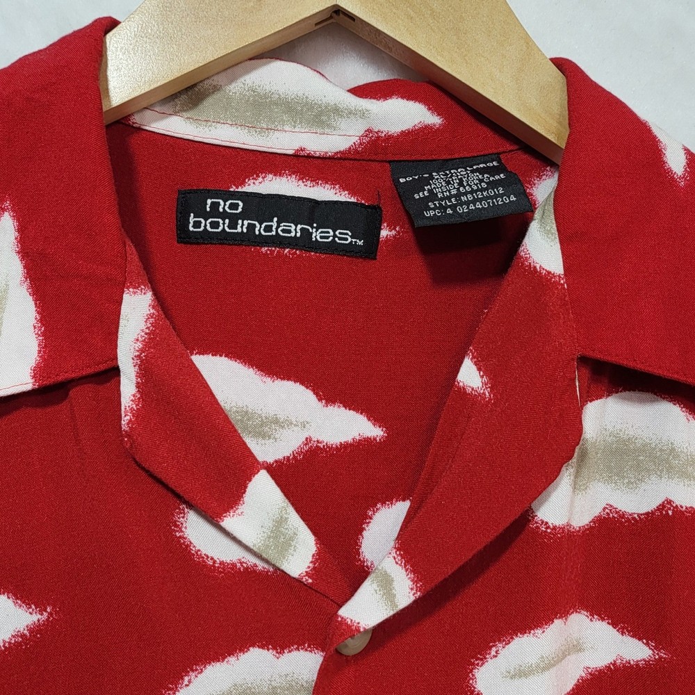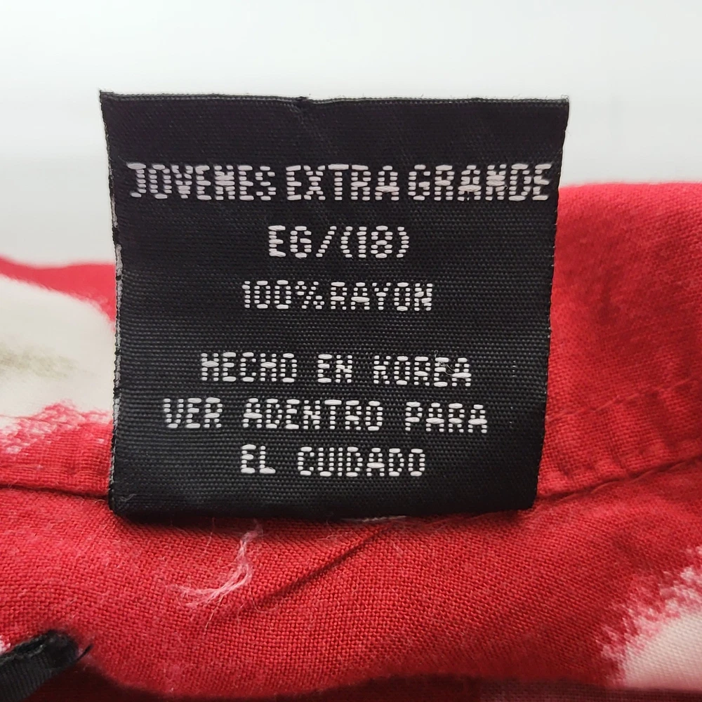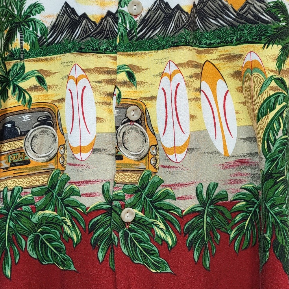 Classic short sleeve button-down shirt features a vibrant tropical beach scene with surfboards, palm trees, and vintage woodie wagons. Crafted from lightweight rayon, this camp collar top offers a relaxed fit perfect for summer vacations or casual wear. The bold red upper is accented by a whimsical cloud print that transitions into a detailed landscape graphic along the hem. Brand: No Boundaries Material: 100% Rayon Style: Hawaiian Camp Shirt Pattern: Tropical Surf Scene Color: Red, Yellow, Green Neckline: Collared Sleeve Length: Short Sleeve Closure: Button Front Hem: Straight Origin: Made in Korea Keywords: Aloha, Surf, Beach, Tropical, Vacation, Retro, Woodie, Palm Tree, Summer, Rayon, Kitsch, Coastal, Kidcore, Boys Fashion • We ship within one business day. • Please compare the measurements to something you already own. Thank you for supporting our small business!