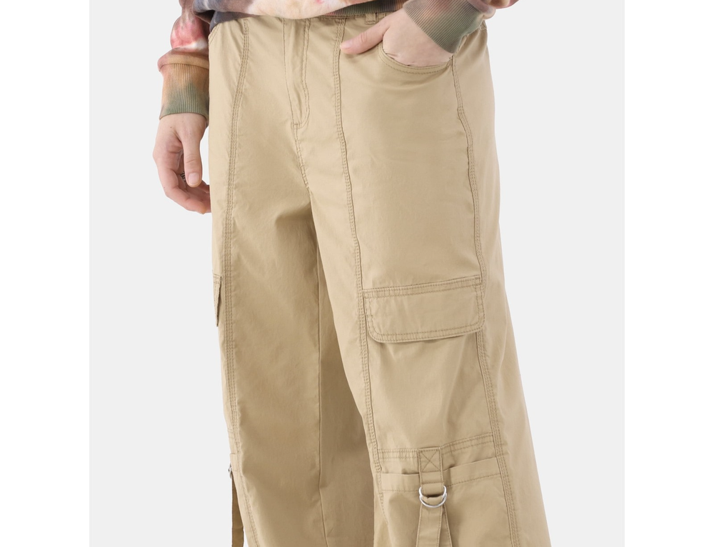 No Boundaries Girl's Cargo Parachute Pants, 29” Inseam ,Hot Cocoa Size L (12-14) Comfortable Material : Made from 98% cotton and 2% spandex for a comfortable and flexible fit. Easy Care : Machine washable for convenient maintenance. Relaxed Fit : Features a relaxed fit with a high rise and 29-inch inseam for a flattering silhouette. Secure Closure : Button closure with zip fly and half-back elastic waistband for a secure and adjustable fit. Ample Pockets : Includes two front pockets, two cargo flap pockets, and two cargo pockets with D-ring closure for ample storage. Stylish Details : Front seam detail and tie accent at the hem add a trendy touch. Versatile Design : Wide leg with a bungee at the hem for a modern and versatile look.