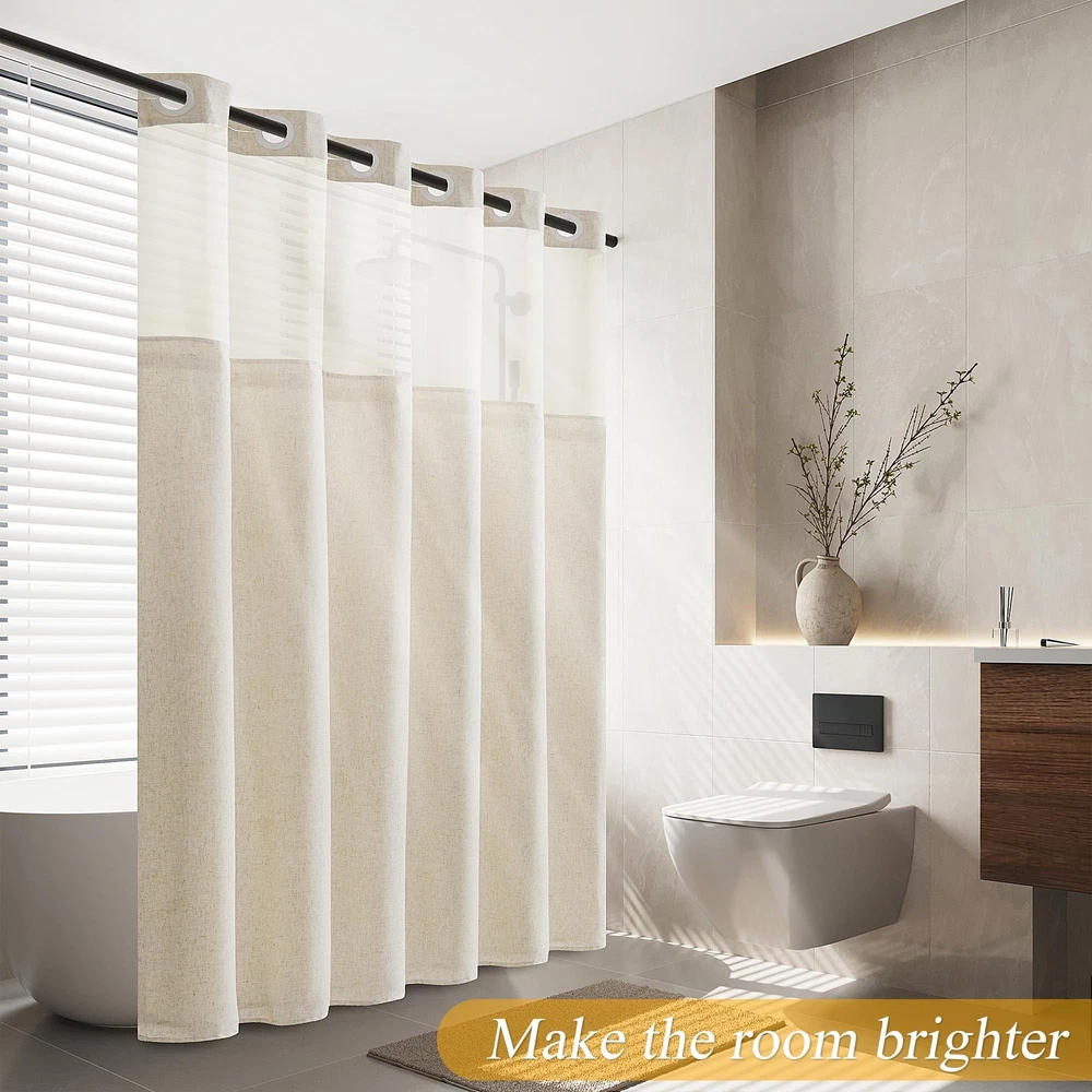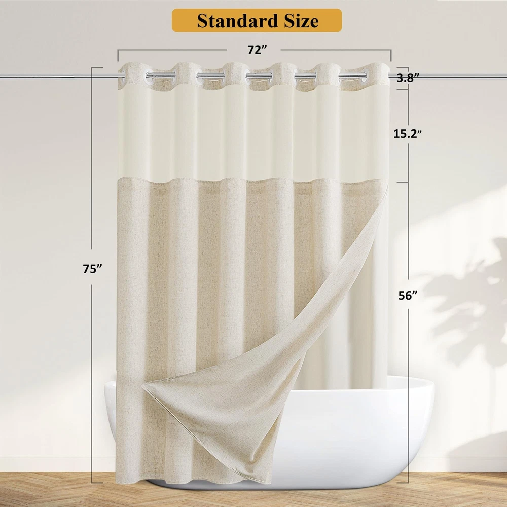 Our linen shower curtain is made of soft material with a water repellent coating on the outer and inner lining, available in a wide selection of colors and sizes such as cream, sage green, white, black, gray, tan, navy, brown, and sizes such as 75inch, 81inch, 87inch This noble linen adds a touch of elegance and sophistication to the bathroom. Create a serene and pleasant atmosphere and turn your daily bathing experience into a luxurious ! Easy Installation Without Hooks: This linen shower curtain designed with "Split Rings", Say goodbye to messy hooks and difficult installations with this no hook shower curtain. It is flex rings(not easily damaged)- making shower curtains easy to hang and remove. No additional tools required, person can do it easil Natural Linen Fabrics: Our outer linen shower curtain is made from 20% natural linen fabric and 80% polyester, which gives the linen shower curtain a soft texture, and the outer layer and lining are added with a water-repellent coating, which allows water droplets to quickly roll off the surface and dry quickly Replaceable Water Resistant Lining: Double layer fabric shower curtain with snap-on removable liner. No hook shower curtain liner prevents water from dripping out of the bathroom, keeps your bathroom dry and clean, makes feel more comfortable when taking a shower. while also making it easier to clean and replace, the shower curtains liner has metal bottom corners to prevent bottom swaying. See-through Top Window: This linen shower curtain features a unique see-through top window, allowing natural light to filter into your shower while still maintaining privacy. It adds a stylish and modern touch to any bathroom space. Easy Care: This linen shower curtain machine or hand washable to keep clean, linen shower curtain no hook fabric dries quickly. 75 inch shower curtain for bathroom fits any standard size shower/tub.
