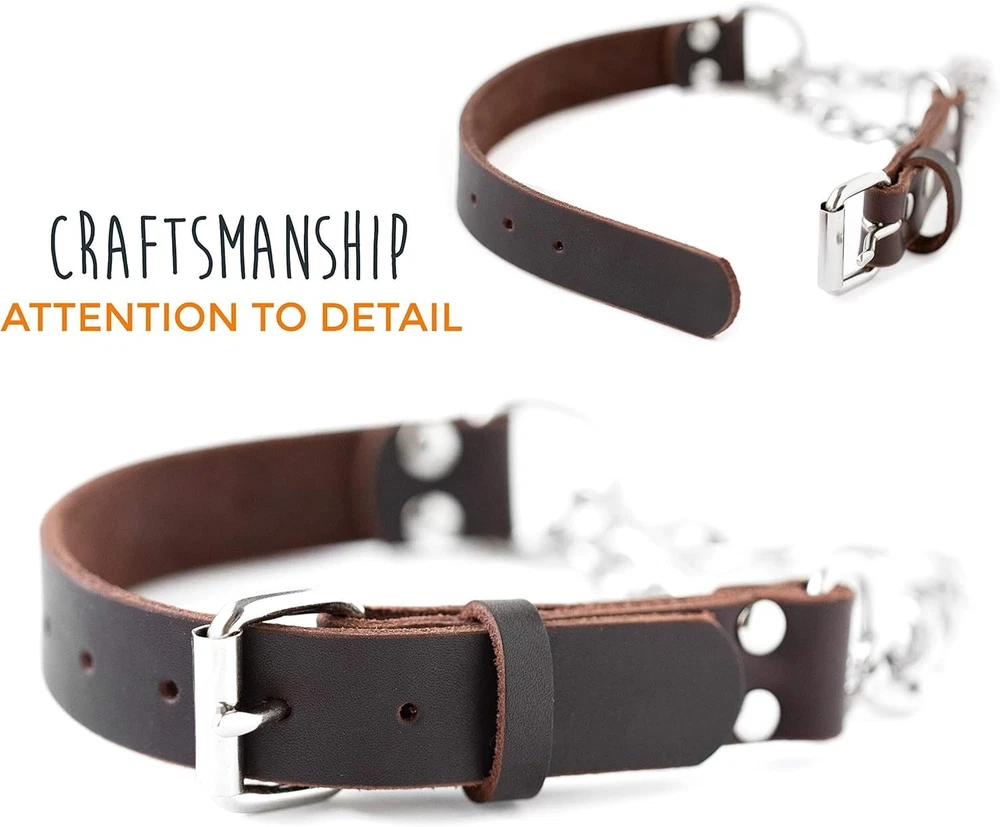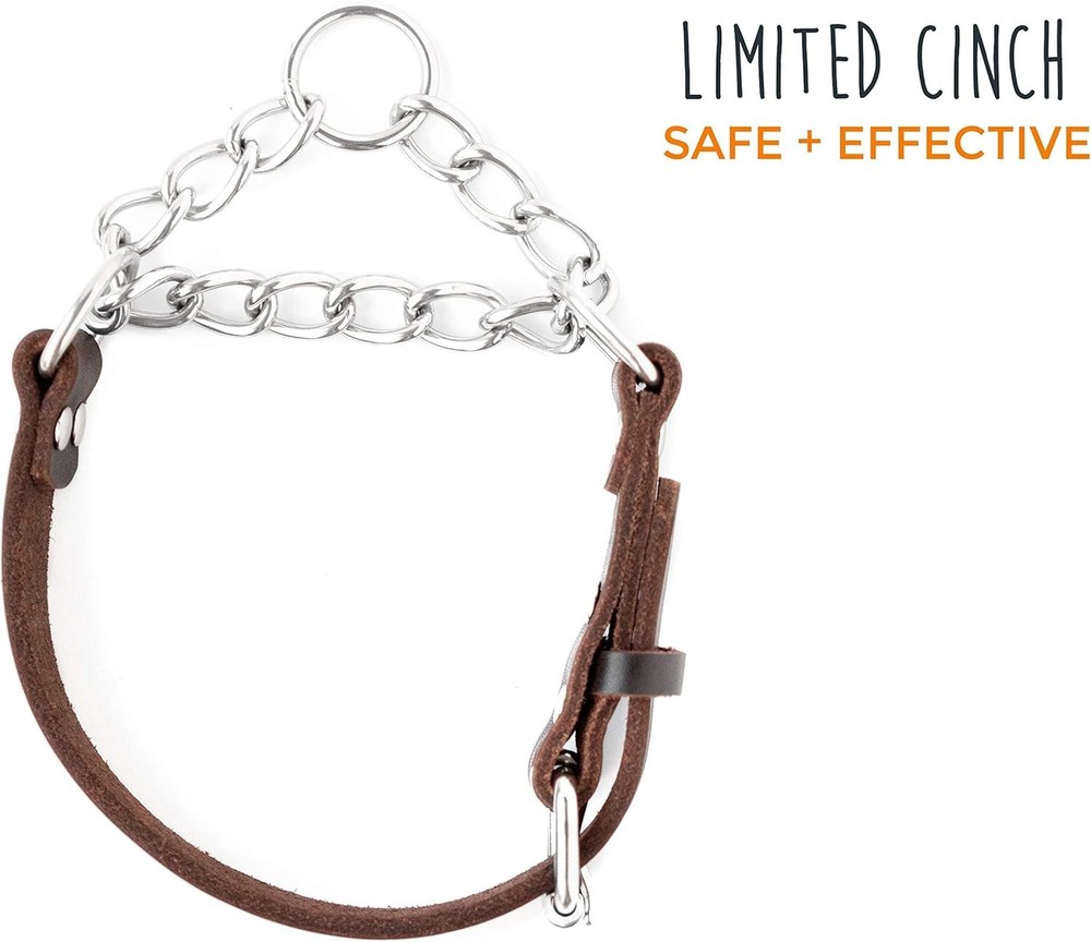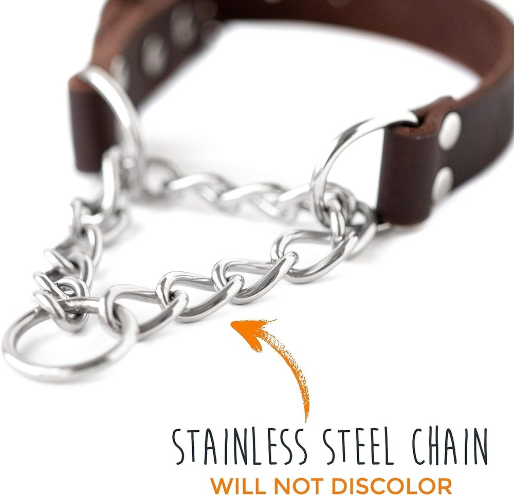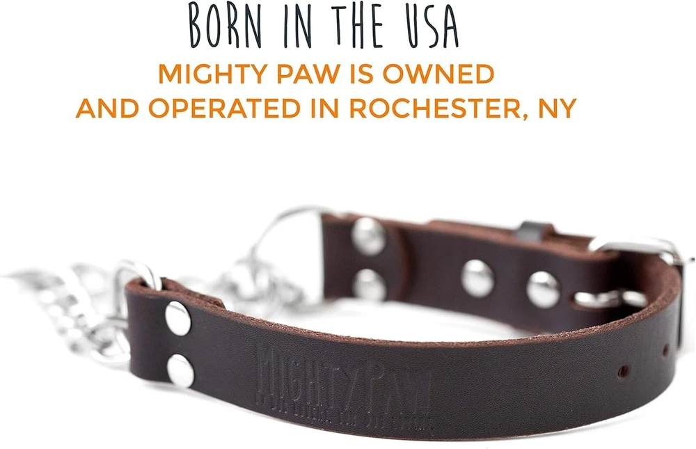 Put An End To Leash Pulling: Highly recommended by dog trainers nationwide, our collar provides cues to aid in dog training. This dog collar pulling solution enhances the training experience by reducing unwanted pulling Safety For Your Pet: Our dog cinch collar offers a gentle and controlled correction. The leather cinch collar for dogs tightens but doesn' t choke, allowing your dog to learn without discomfort. It's a humane alternative to a dog choker collar Durability and Quality: This adjustable leather dog collar is the only one you' ll ever need. Constructed with 100% genuine leather and a stainless-steel chain, this dog chain collar is far superior to others made with regular metal hardware Dog Trainer Seal of Approval: With endorsements from thousands of dog trainers, our martingale collar with chain stands out from the crowd. Celebrated for its durability, effectiveness, and stainless-steel chain, it's a top choice for dog training collar Proudly Made In The USA: At Mighty Paw, we' re family-owned and operated out of Rochester, NY. Our leather collar dog is designed and made with love, right here in the USA Product Description Size(s): Small - Length: 12-15.5” - Width: 0.75” Medium - Length: 15.5-19” - Width: 1” Large - Length: 19-22.5” - Width: 1” Features: The 100% stainless steel chain provides improved durability; 100% premium quality leather and stainless-steel chain is built to withstand all-weather conditions; Other chain dog collars are made with nickel-plated iron which can cause discoloration on your dog’s fur. Our collar is constructed with a stainless-steel chain eliminating discoloration and maximizing durability Designed to make training with your dog safe and effective; collar tightens under tension but only tightens enough to provide a subtle controlled training cue to your dog; Endorsed by thousands of trainers, this collar is preferred because of its gentle nature and extreme effectiveness; Collar is only intended for use while your dog is on their leash – leash not included. About Mighty Paw: Mighty Paw is a family-owned and -operated business out of Rochester, NY. At Mighty Paw, we believe that going for a run or walk with your dog is one of life’s greatest pleasures. That’s why we strive provide high-quality, functional dog products that make life easier and more comfortable for you and your pet while encouraging activity and adventure. Mighty Paw. By Dog Lovers. For Dog Lovers.