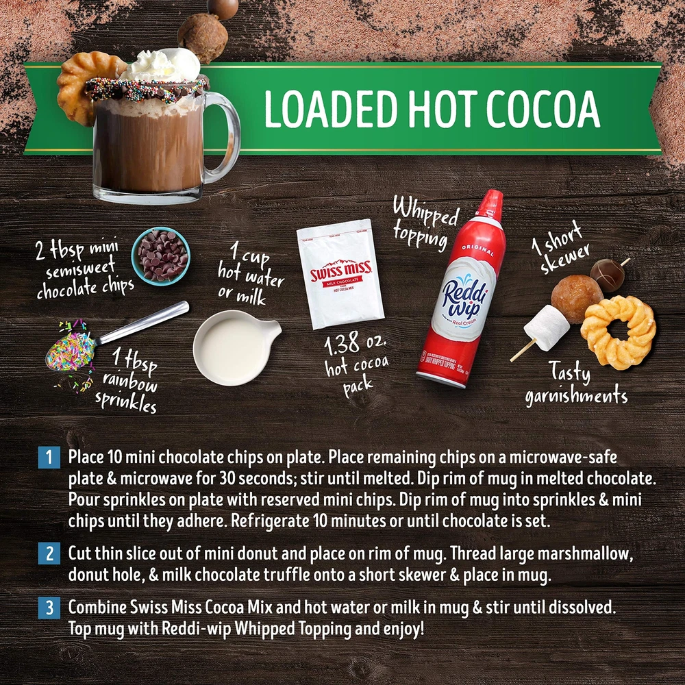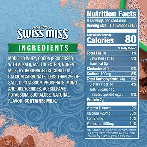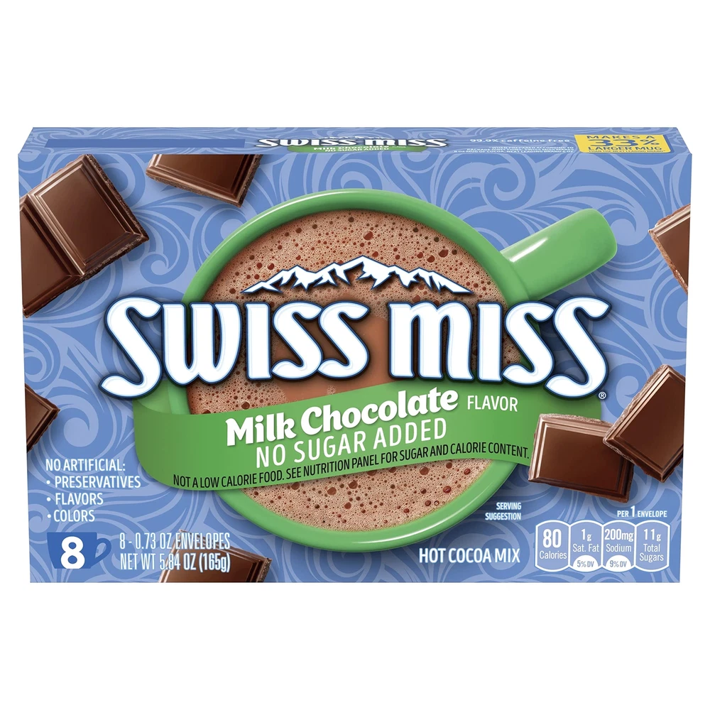 Enjoy each sip of Swiss Miss Milk Chocolate Flavor No Sugar Added Hot Cocoa Mix. It's the warm, comforting hot cocoa drink that's perfect for mornings, snow days and sweet evening treats. Made with real milk, this Swiss Miss Milk Chocolate Flavor Hot Cocoa with no added sugar is a delicious, sensible treat. This milk chocolate flavored hot drink has 80 calories per serving and has no artificial flavors, colors or preservatives. So, after a long day of work or play, enjoy a moment of milk chocolatey relaxation. Whatever you're warming up to, know that you'll find delights in every mug of Swiss Miss Hot Cocoa Mix. Includes twelve (12) 8-count boxes of Swiss Miss Milk Chocolate Flavor No Sugar Added Hot Cocoa Mix with 0.73-ounce packets Swiss Miss Milk Chocolate Flavor Hot Cocoa has 80 calories per serving and is 99.9% caffeine free This creamy hot cocoa drink has no artificial flavors, colors or preservatives Swiss Miss Hot Cocoa Mix is made with real milk and no added sugar to delight chocolate lovers of all ages When you or the family are looking for a quick and easy treat, reach for a mug of Swiss Miss No Sugar Added Hot Cocoa Mix
