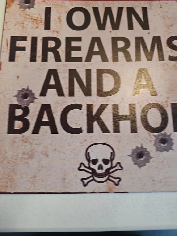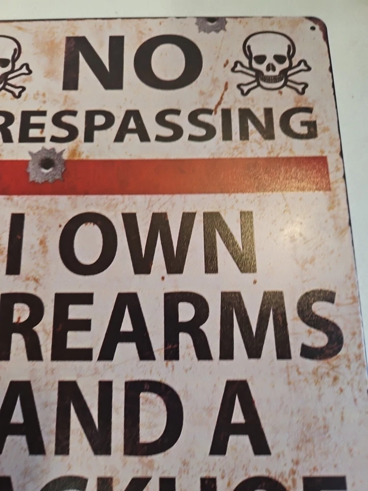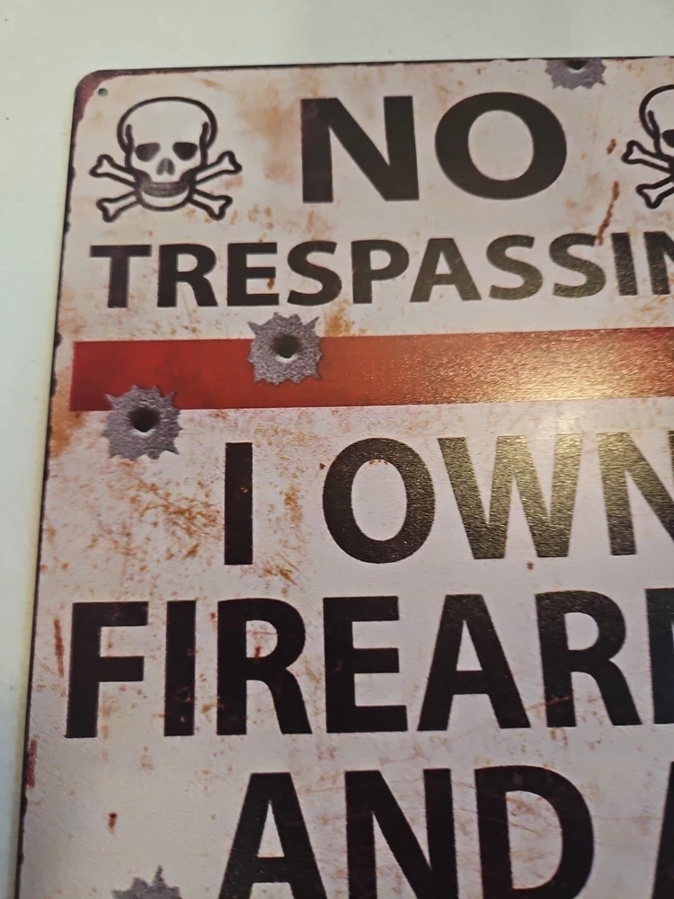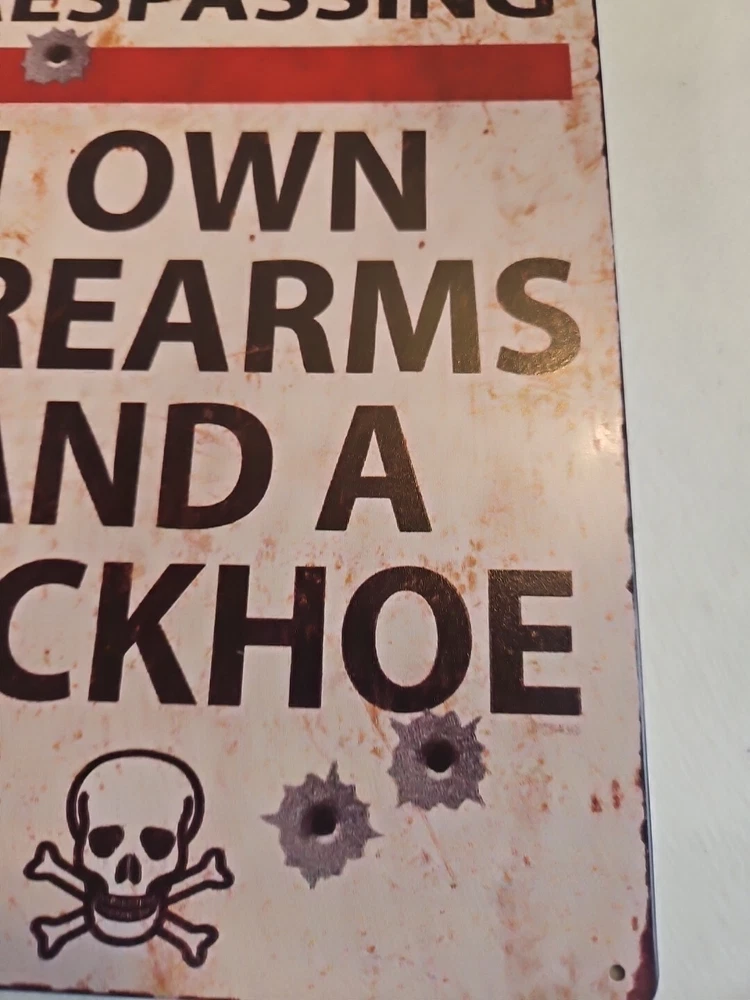 This rustic-looking 8x12 metal sign is perfect for anyone who wants to add a touch of humor and novelty to their space. The sign features a warning against trespassing, with a playful and eye-catching design that includes a firearm and a backhoe. Crafted from high-quality metal, this sign is durable and weather-resistant, making it suitable for both indoor and outdoor use. It can be hung on a wall or door, or mounted on a flat surface using the provided mounting hardware. The sign is also decorated with a rusted look that adds to its primitive style.