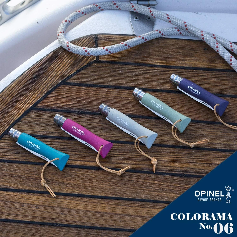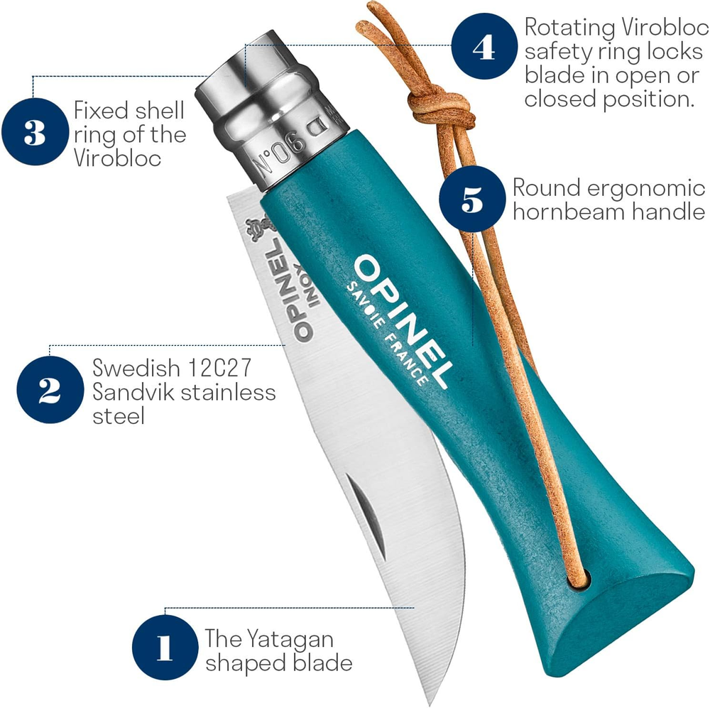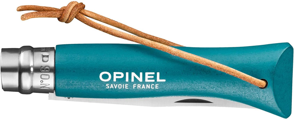PERFECT POCKET CARRY: The No.06 folding knife is lightweight and just the right size for tossing into your bag or pocket, so you're never without an Opinel! Whether you're opening packages, or having an impromptu picnic, your No.06 has you covered. PATENTED VIROBLOC: A hallmark of Opinel everyday carry knives since it’s invention in 1955, the Virobloc ring offers a unique, thoughtful, and easy to use safety mechanism for locking the blade during use, during transport, and during storage. INOX BLADE: We use Sandvik 12C27 Modified Stainless Steel. It is anti-corrosive thanks to the addition of chrome and requires no special maintenance. Carbon content of at least 0.40% provides an excellent cutting edge and is easily sharpened. THE CROWNED HAND: In 1565 King Charles IX commanded every knife maker to stamp an emblem on their products to guarantee their origin and quality. In 1909 in order to honor this tradition Joseph Opinel chose the Crowned Hand as his emblem. AN ICON OF FRENCH CULTURE: Produced in the heart of the French Alps since 1890, Opinel knives draw simplicity and durability from their mountain roots. Opinel kitchen knives have been adopted worldwide and recognized as a design icon. Product Description THE No.06 COLORAMA STAINLESS STEEL POCKET KNIFE The No.06 is the smallest model that features the Virobloc safety ring which will lock the knife securely open, or closed. Take it everywhere, or hang it from places with the leather lanyard. The blade has been designed and perfected over generations to maximize the cutting quality and ensure it’s easy to sharpen after years of hard work. Use it in the garden, at the dinner table, or even on your next adventure. Keep the knife in your pocket, purse or toolbox and we are certain you'll love it for years to come. THE RIGHT FEATURES AT THE RIGHT COST Opinel uses Sandvik(R) 12C27 Modified stainless steel. The Swedish steel is well known for its anti-corrosive properties which requires minimal upkeep. Its carbon content of at least 0.40% provides an excellent cutting edge which is also easy to keep sharp. The patented VIROBLOC locking mechanism keeps your knife safely closed in your pocket and locks the blade open during use. The simplicity of the knife’s design and it’s sustainable wooden handle makes the knife lightweight too! THE PERFECT SIZE FOR EVERYDAY CARRY Both smart and simple, the Opinel folding knife is composed of 5 elements: the blade, the wooden handle, the fixed ferrule, the rivet and the rotating VIROBLOC locking ring which was added in 1955 to sizes No.06 and above. The knife is equipped with a 2.8 inch blade, open length 6.5 inches and weighs in at an efficient 45 grams! CARING FOR YOUR KNIFE All Opinel wooden-handle knives are not designed to be washed in the dishwasher. Heat and moisture will cause any wood to swell which will make the knife hard to open at times. Opinel suggests carefully hand-washing your knives and leaving them out to air dry. The Sandvik 12C27 Mod. Stainless Steel used for the blades is low maintenance, meaning it is highly resistant to rust and can be polished or cared for with simple organic oils. MADE IN THE FRENCH ALPS FOR OVER 130 YEARS Joseph Opinel designed his first pocket knife in 1890, creating a tool that is as robust and functional as it is simple and beautiful. From his workshop at the foot of the French Alps, Opinel forged a cult classic. Generations of artists, explorers, and farmers have carried the instantly recognizable, imminently useful Opinel knife in their pockets. Little has changed since 1890. Rooted in history and a commitment to craftsmanship, the Opinel family still makes their knives in the Savoie region of France. Each year, THEIR team of 150 employees in France manufactures over 5 million knives, ranging from outdoor tools to kitchen knives, all to honor Joseph Opinel’s focus on quality and simplicity.