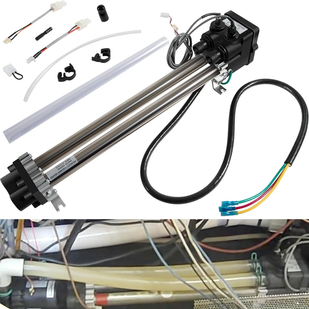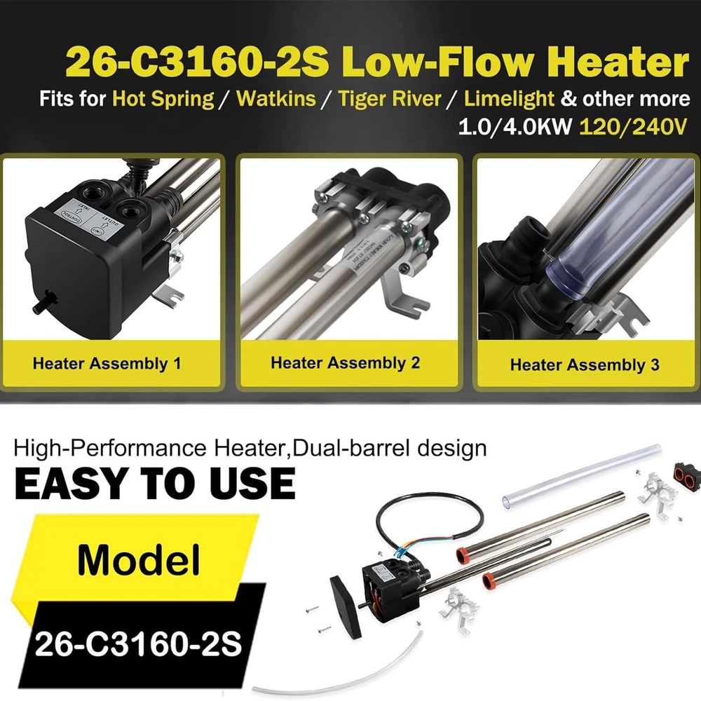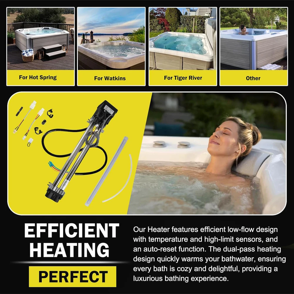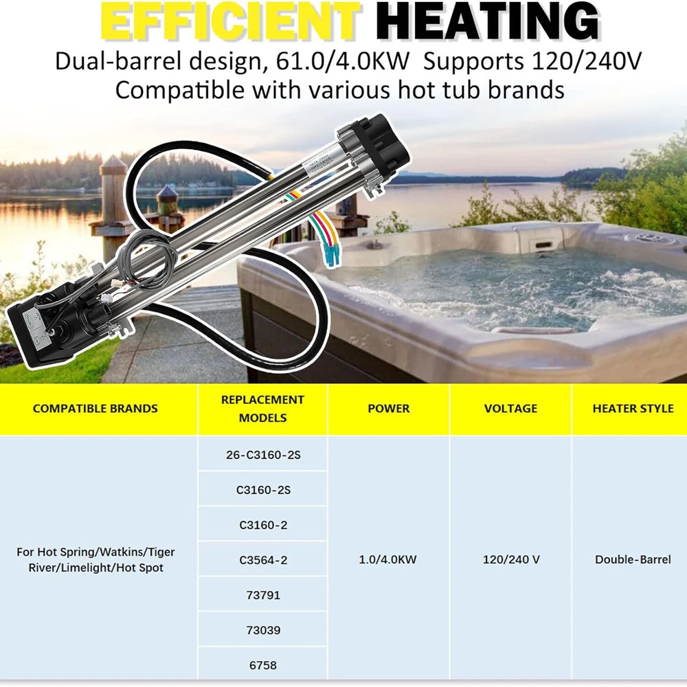 No-Fault Spa Heater for 1995+ Hot Spring Watkins Tiger River 4kW Titanium 73791 Fitment: Suitable for many 1995 to current Watkins No-Fault, Hot Springs, Tiger River, Hot Spot, Caldera and Laing tri-bend hot tubs spa models Features: 1) Replace for Watkins Heater Cross Reference MATRIX 26-C3160-2S, C3160-2S, 73039, 73791, 76228, C3564-2, 25-250-1022. Also suitable for old trumpet-style Laing Infinity 6758, IHH-4000-NHCW and IHH-4000-NHCW-6758 Triple Bend heater (confirm the number on the heater data label correctly matched) 2) 2 Sensors / Wattage: 4.0KW 240V, 1.0KW 120V / Element Material: Titanium / Amperage: 17A 240V, 8.5A 120V / Required Flow Rate: 8 GPM / Voltage: 120V or 240V / 1/4 inch tubing connection / 1/4 inch tubing extension kit / 3-wire cord 3) No Modifications Required. Includes a Bleed Tube Extension Kit with coupling & clamps for ease of installation on some spa models 4) Direct replacement for Hot Spring 4 KW PDR Heater Assemblies. Low Flow design improves efficiency. Temperature & Hi-Limit Sensors included - PDR Auto reset. Double-pass sleek design replaces discontinued trumpet style heater assembly. The double-pass feature efficiently heats the water in two stages. 4.0kW Titanium extended service life heater element Package included: 2 sensors with new style 4-pin sensor plugs (2002+) and an auto-reset high limit, 18" of 1" O.D. Tubing, 12" of 3/8" O.D. Tubing, Instructions, Barb Coupling .25" x.25", Clamps, 3 wire power cord Payment Shipping Policy Contact US About us Returns Policy Payment Please purchase and pay for the item through the eBay,only accpected the paypal payment. Shipping Policy The item will be shipped within 24 hours on payment received except the holidays.(except weekends & official holidays). You can log on to eBay to check your logistics tracking number. We use multiple warehouses for delivery and will select the nearest warehouse for delivery, according to your order address and our inventory. Shipped via USPS, UPS or FedEx (depending on location and package weight) Please confirm address before purchase, and cannot change address once purchased. Contact US 1. Negative & neutral feedback will not help resolve any problems you have, please contact us via eBay messages before leaving negative & neutral feedback, our customer service will make best effort to help you with the issues. 2. We hope to give you a positive eBay experience by working hard, and we expect to receive a positive feedback and Detailed Selling Rating (DSR) of 5 Rating in ALL of the feedback categories (Item as described, Communication, Shipping Time and Shipping and handling charges) from the buyer upon receiving the item . 3. If you are not satisfied with our items or service, please don't hesitate to contact us before you leave any Neutral/Negative feedbacks, we will always try our best for 100% customer satisfaction. About us Our goal is complete customer satisfaction. We will be very honored to provide you with quality service. Our products are a 100% authentic and brand new. We work with the biggest suppliers of high quality products to bring you only the best items. No customer will walk away from our store unhappy. If there’s a problem, just let us know and we fix it. Contact information: Our office hours are MONDAY - Saturday 9:00PM - 6:00PM PST, but we will response you within 24 hours we get your message.There will be some delay on respons if you send message or E-Mail on Sundy. Returns Policy Please contact us first when return, exchange and refund is required. Any direct return of purchased items will not be processed. If the product is defective or damage upon arrival,please contact us immediately,we will provide the solve the problem. Returns accepted within 30 days of delivery date and item must be in original new condition. When returning an item, it must be in all of the original packaging and include all of the original accessories or items that came with it. The item and package should be in original and perfect condition.