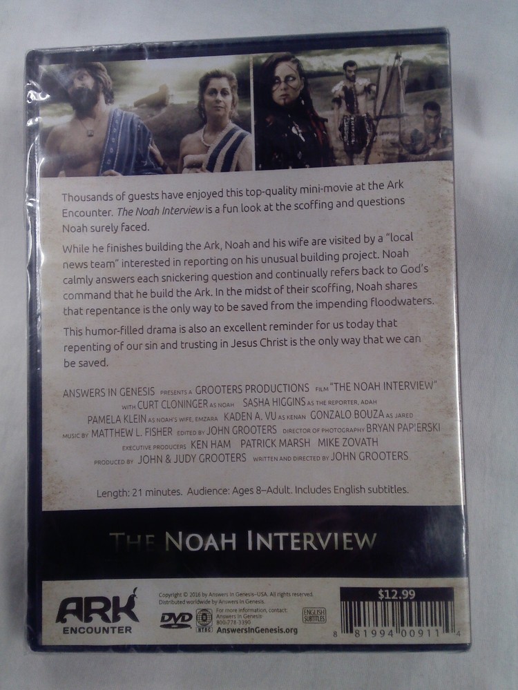 Actor: Curt Cloninger, Sasha Higgins, Pamela Klein Director: John Grooters Genre: Educational Sub-Genre: Religious Season: n/a Type: Short Film Edition: Standard Edition Movie/TV Title: the noah interview Subtitle Language: English Region Code: DVD: 0/All (Region Free/Worldwide) Format: DVD Rating: NR Features: Widescreen, With Subtitles Video Format: NTSC Run Time: 21' Case Type: Tall/DVD Case Studio: Answers In Genesis Aspect Ratio: 16:9 Release Year: 2016 Language: English Country/Region of Manufacture: Unknown gtin13: 881994009114 UPC: 881994009114