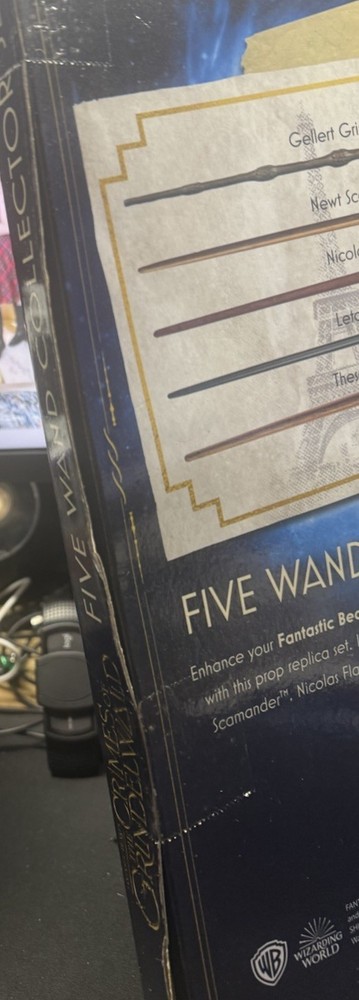 The Noble Collection The Crimes Of Grindelwald Five Wand Collector Set is a highly sought after collectible for fans of the Harry Potter franchise. This set includes five intricately designed wands inspired by the iconic magical world created by J.K. Rowling. Each wand is meticulously crafted and embodies the essence of the fantasy genre, making it a must-have for any collector or Harry Potter enthusiast looking to add a touch of magic to their display. With The Noble Collection's reputation for quality and attention to detail, this set is sure to be a prized possession for any fan of the series. The box is banged up (see pictures), but the wands are new in the box. Set includes the wands of Gellert Grindewald/Albus Dumbledore (Elder Wand), Newt & Theseus Scamander, Leta Lestrange and Nicolas Flamel.