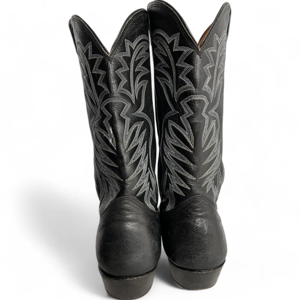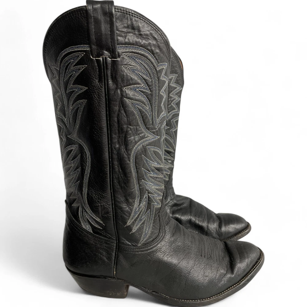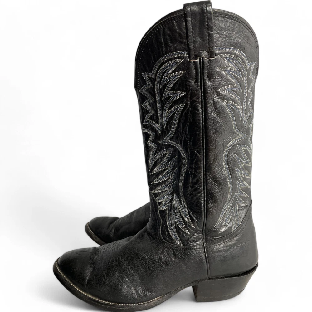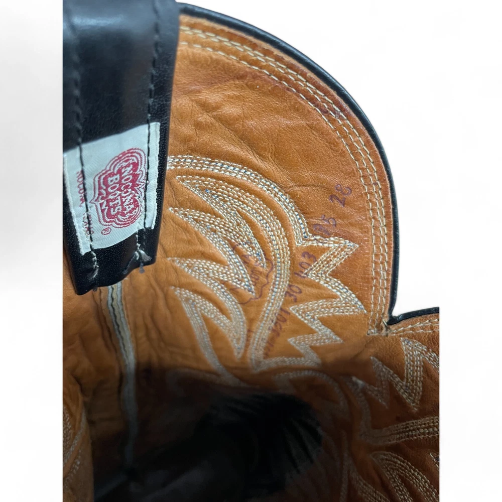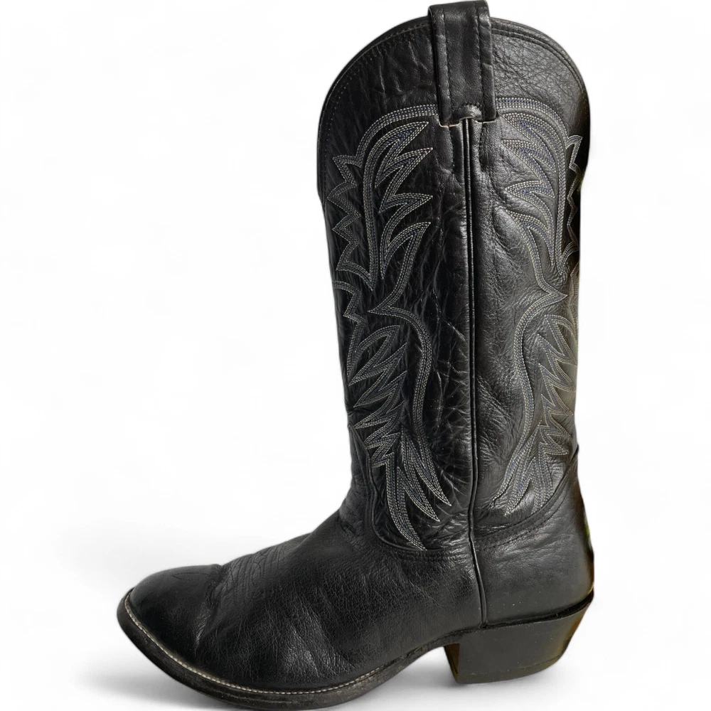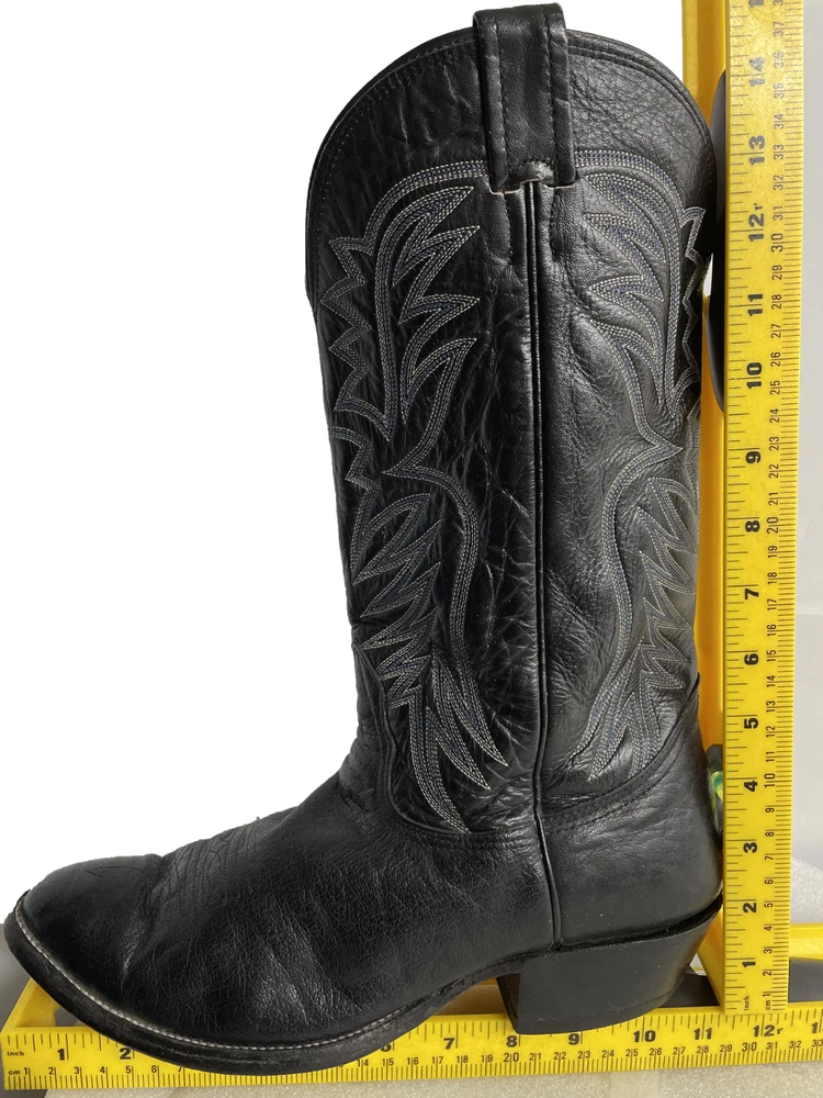 Type: Boot Toe Shape: Almond Toe Department: Men Features: Comfort Closure: Pull On US Shoe Size: 9.5 Theme: Biker, Cowboy, Western Accents: Embroidered Pattern: Western Shoe Width: EE Upper Material: Leather Brand: Nocona Style: Western Color: Black Model: 3501