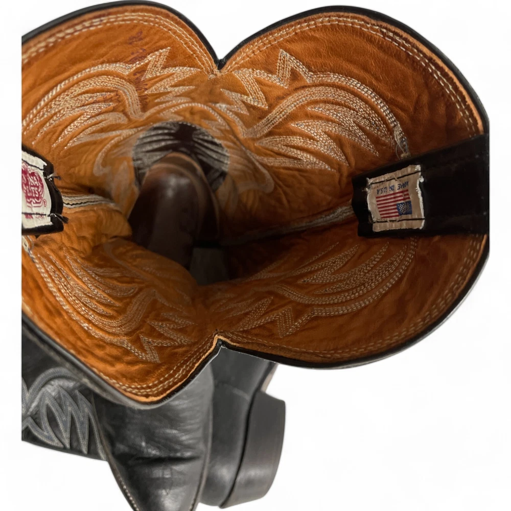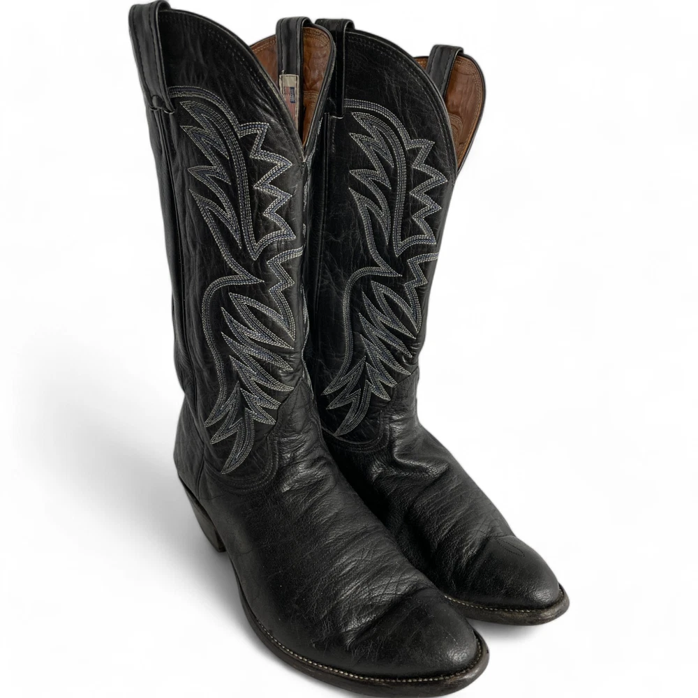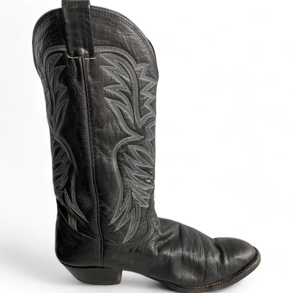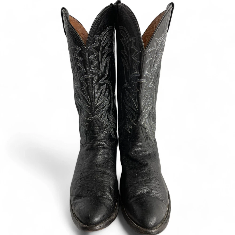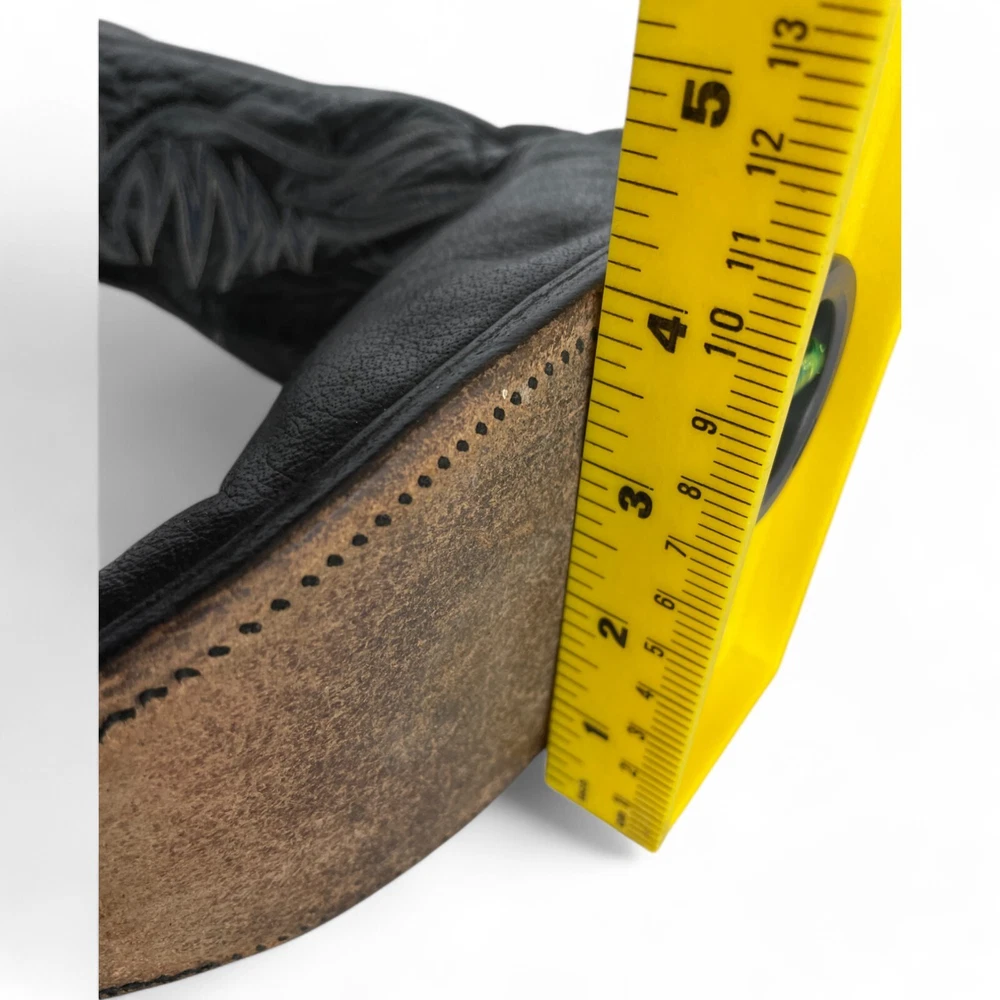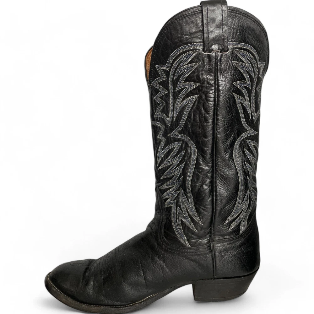 Type: Boot Toe Shape: Almond Toe Department: Men Features: Comfort Closure: Pull On US Shoe Size: 9.5 Theme: Biker, Cowboy, Western Accents: Embroidered Pattern: Western Shoe Width: EE Upper Material: Leather Brand: Nocona Style: Western Color: Black Model: 3501