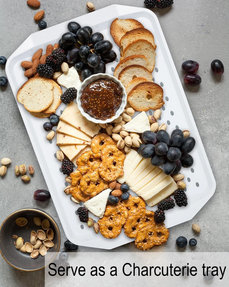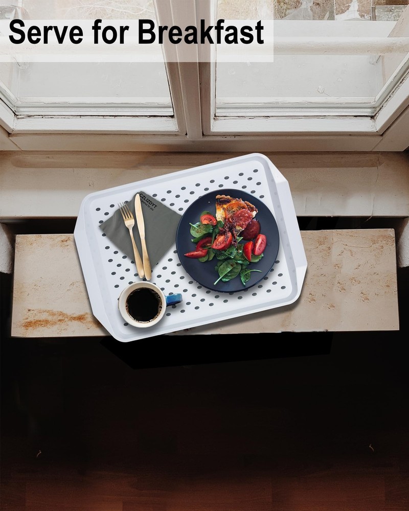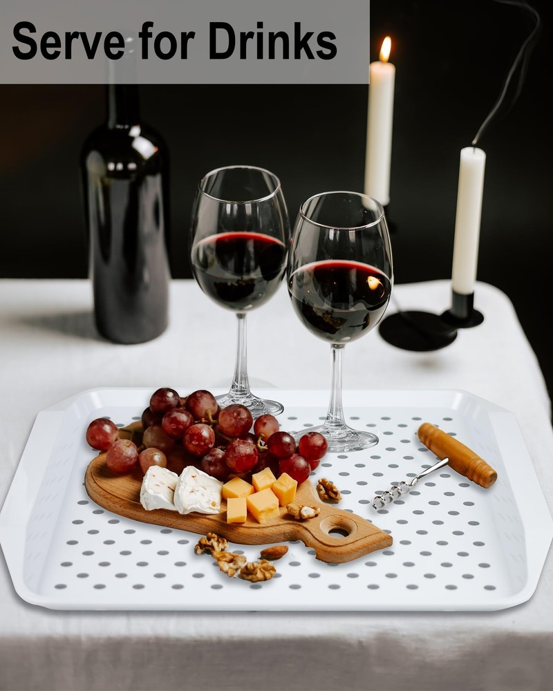 Non Slip Serving Tray with Handles, White STURDY NONSLIP SERVING TRAYS: The non-stick dots on the surface are ideal for carrying glass or plates without sliding around. Moreover, the bottom has a grippy stripes, which can ensure trays stay lap or hands without sliding off and won't scratch the table VERSATILE TRAY: It is great to transport your food as breakfast or dinner tray, perfect for a snack or cup of coffee working as a bed tray for eating, Nice for enjoying football match in a recliner to be tv trays, to Keep in the car for tailgating while traveling, to have picnics and carry dinner to the porch, to celebrate activities at outdoor patio, etc. PREMIUM MATERIAL: Made of plastic and rubber material, it is a stiffer food tray, direct food contact with this tray is available. This plastic serving tray is shatterproof and will not lose its flat surface overtime, dishwasher is not applied in this tray, we recommend to clean by flowing water or damp cloth ( 2pcs cleaning pack are included ) THOUGHTFULLY DESIGNED: The size is manageable Roomy enough for a 10” dinner plate, glass and saucer on it, looking as a modern rectangular style meal tray with hand size fit, it is easy to hold on hands and stackable for storage in your kitchen. It doesn’t stain and easy to clean BRAND FEATURE: Best wish for life and minimized messes, try to provide confident building trays for serving food, and willing to think more for those who get a bit hand shaky, Great for older people to eat on, messy fur babies who eat off in the meals, the pets who contain messy kibble on the floor
