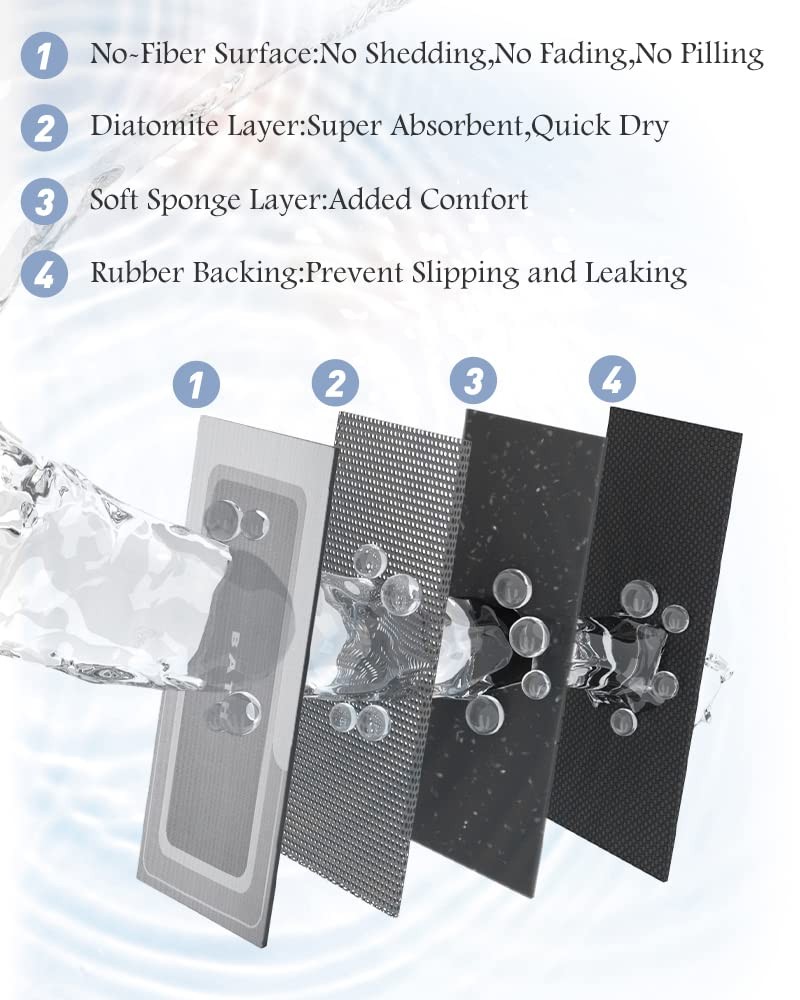 Bathroom Rug Mat-Bath Mat Rug for Bathroom Non Slip Absorbent No Stains Quick Dry Bathroom Floor Mat Washable-Thin Bathroom Rugs Fit Under Door-Rubber Bathmat Shower Rug Innovative Soft Diatomaceous Earth Bath Mat: Experience the perfect blend of comfort, functionality, and innovation with our luxury bath rug. Bathroom floor mat features a smooth leather-like surface for easy maintenance, a cushioning sponge layer for added comfort, a super absorbent and quick-drying soft diatomaceous earth layer, and a durable rubber backing for added stability. Absorbent & Stain Resistant: Its specially engineered nano-porous smooth surface instantly absorbs dripping water, leaving no conspicuous watermarks or stains. Whether stepping out of the shower or washing your hands, you can trust this super absorbent bath mat to keep your space clean and safe. Easy Clean& Quick Dry: Cleaning is a breeze with the stain-resistant surface, making it ideal for households with pets. A simple wipe or rinse will restore the shower rug to its brand-new appearance. The quick dry bath mat's numerous tiny pores facilitate fast water evaporation in natural air, magically vanishing watermarks within minutes. Bathroom mat quick dry and won’t be too damp for the next user. Anti-Skid & Anti-Leakage: The rubber backing has better skid-resistance comparing to other TPR or PVC backings, make the bath mats for bathroom non slip even on wet floor. Waterproof rubber backing of the non slip bath mat can prevent water from seeping underneath and spreading. Even when wet for a prolonged period, the rubber bath mat won’t be smelly. Durable&User-friendly: Unlike ordinary mats, our bath rugs for bathroom resist pilling, fading, and shedding, distinguishing it from traditional microfiber bath rugs. Thin bath mat with proper thickness minimizes tripping hazards and allowing easy passage for doors or wheels. Choose from various sizes, including small bath mat(17"x27", 17"x35") and long bathroom runner (17"x50", 17"x59", 17"x70").
