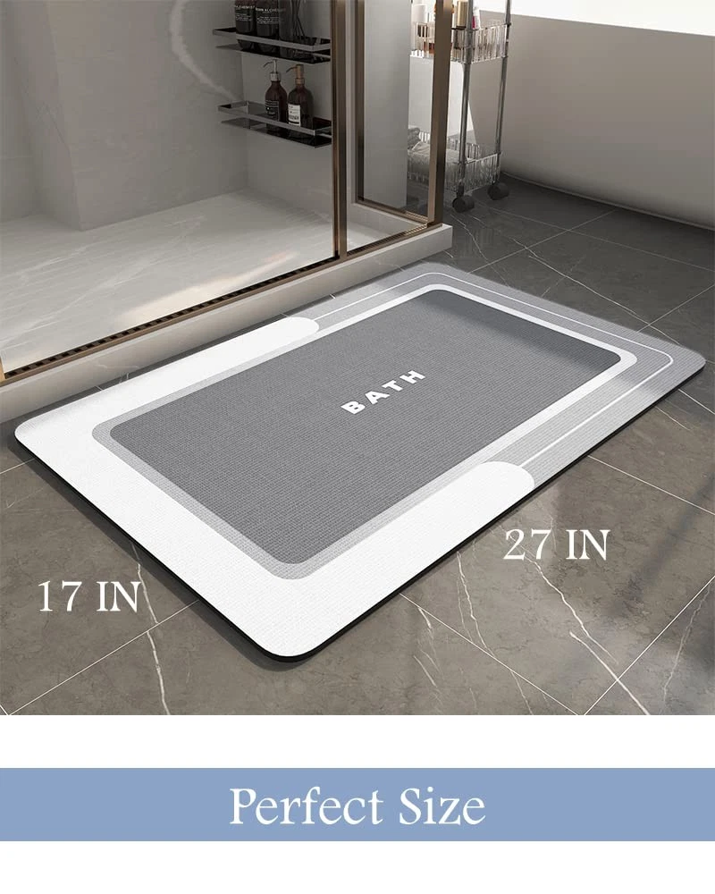 This bath mat is a game-changer! The ultra-absorbent diatomaceous earth layer soaks up water instantly while remaining quick-drying. Love the plush comfort underfoot and how securely the non-slip base stays in place. The sleek, stain-resistant surface wipes clean effortlessly, and the thin profile fits perfectly under my bathroom door. After weeks of use, it still looks brand new - no stains or odors. The perfect combination of luxury and practicality for any modern bathroom!