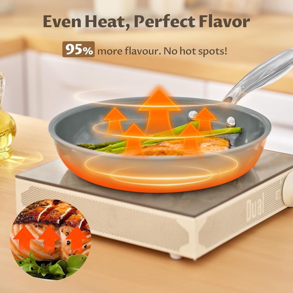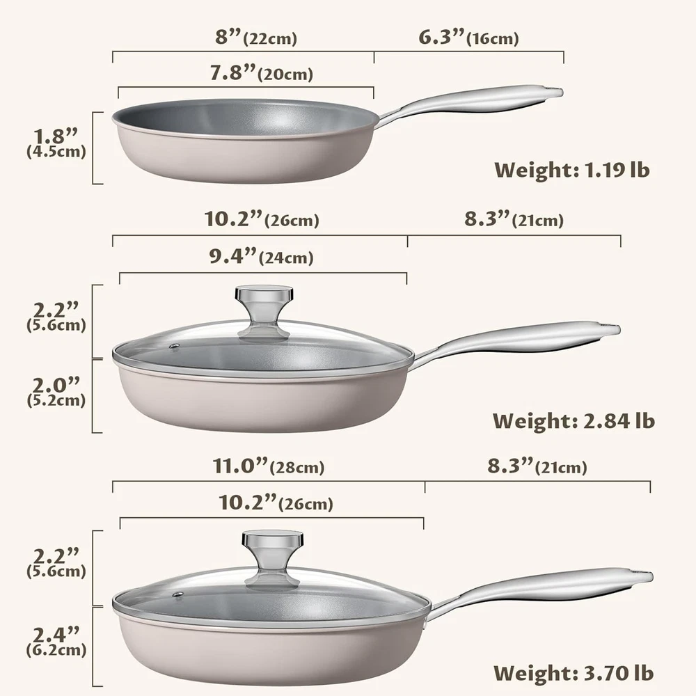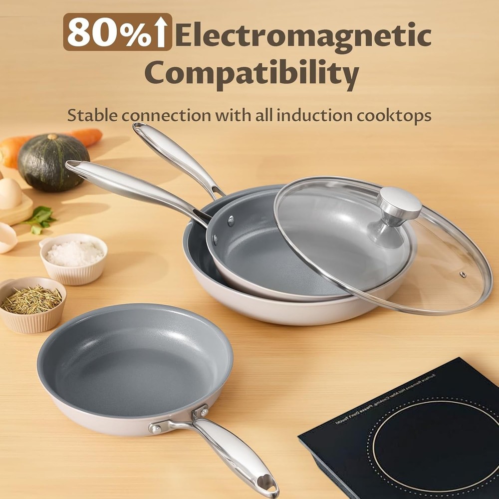 About this item - : Our induction cookware set provides a maximum contact area for faster, more energy-efficient cooking and offers unmatched durability that surpasses dotted bases % : Thanks to our molecular-bonded full-surface induction layer, direct energy transfer with minimal loss cuts down your electricity bill, saving you time and energy from the very first use %- : Say goodbye to flickering and error messages common with dotted bases. Our seamless base of non stick frying pans deliver a stable connection on all induction hobs : Unlike spot-welded bases that can buckle over time, our ceramic frying pan's molecular-bonded base resists deformation and delamination for superior durability : The seamless molecular-bonded layer ensures every inch of the frying pan heats evenly, so your food never scorches in the center while the edges remain uncooked : Whether induction, ceramic, gas, or electric, this pan delivers excellent performance on all stoves. Oven-safe up to 230°C - -: Food slides right out. The exceptional food release means cleanup is incredibly fast and simple. Added peace of mind - our ceramic frying pans are 100% free of PTFE and PFOA - : Includes induction pans with diameters of 8", 10" and 11", as well as 2 pan lids. This all-in-one set covers everything from quick single portions to large family meals : This kitchen frying pan set is more than just a gift — it's something they'll truly use and enjoy. With its stylish design, it’s perfect for Christmas, housewarming parties, New Year’s, Mother’s Day or wedding Material: Aluminum, Ceramic Coating, Free of PTFE , PFOS and PFOA Color: Gray Brand: Size: 5-Piece Frying Pan Set with Lids Handle Material: Cast Steel