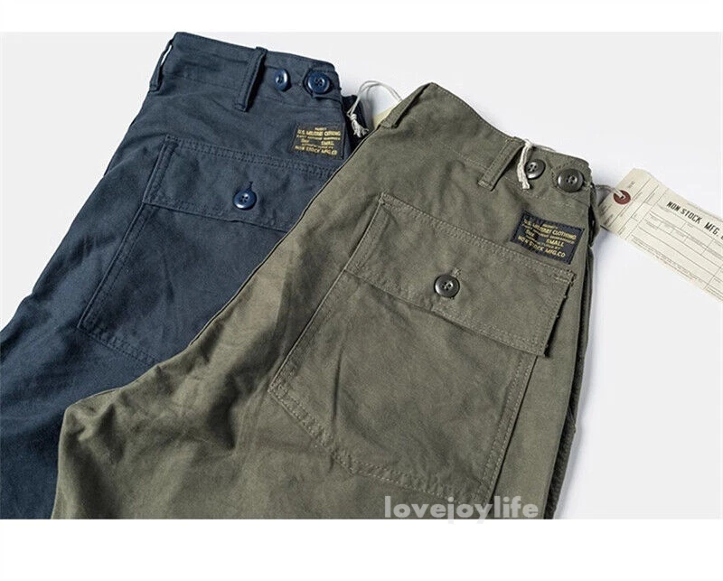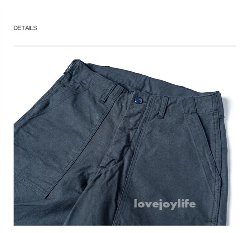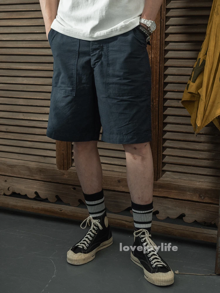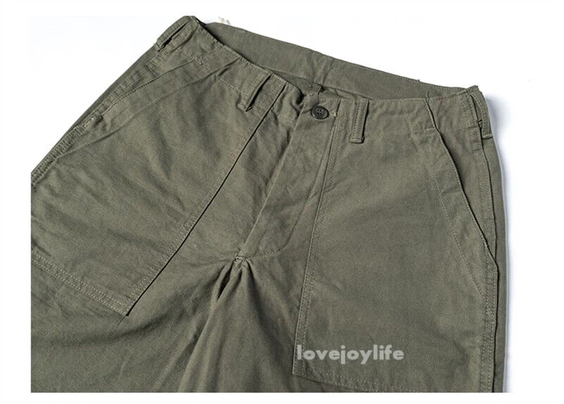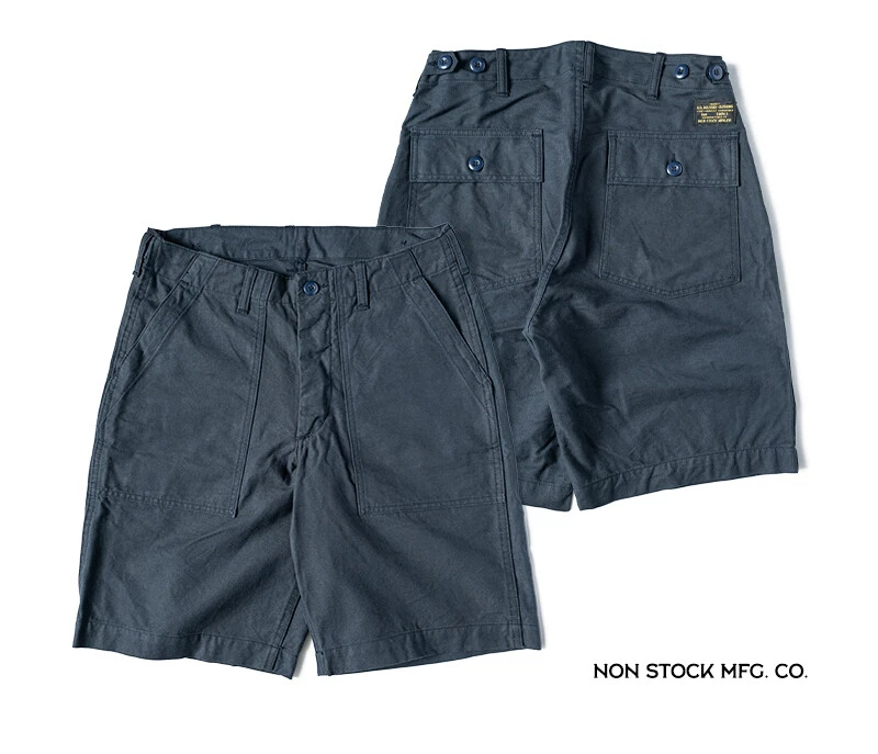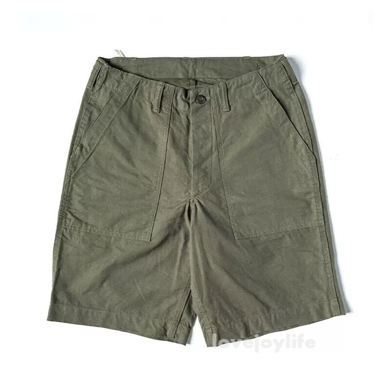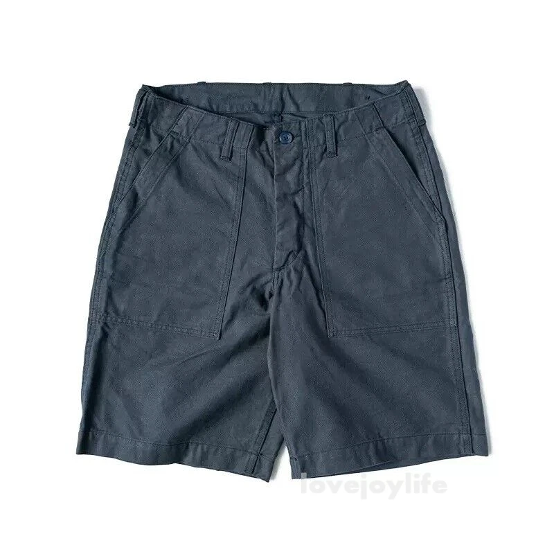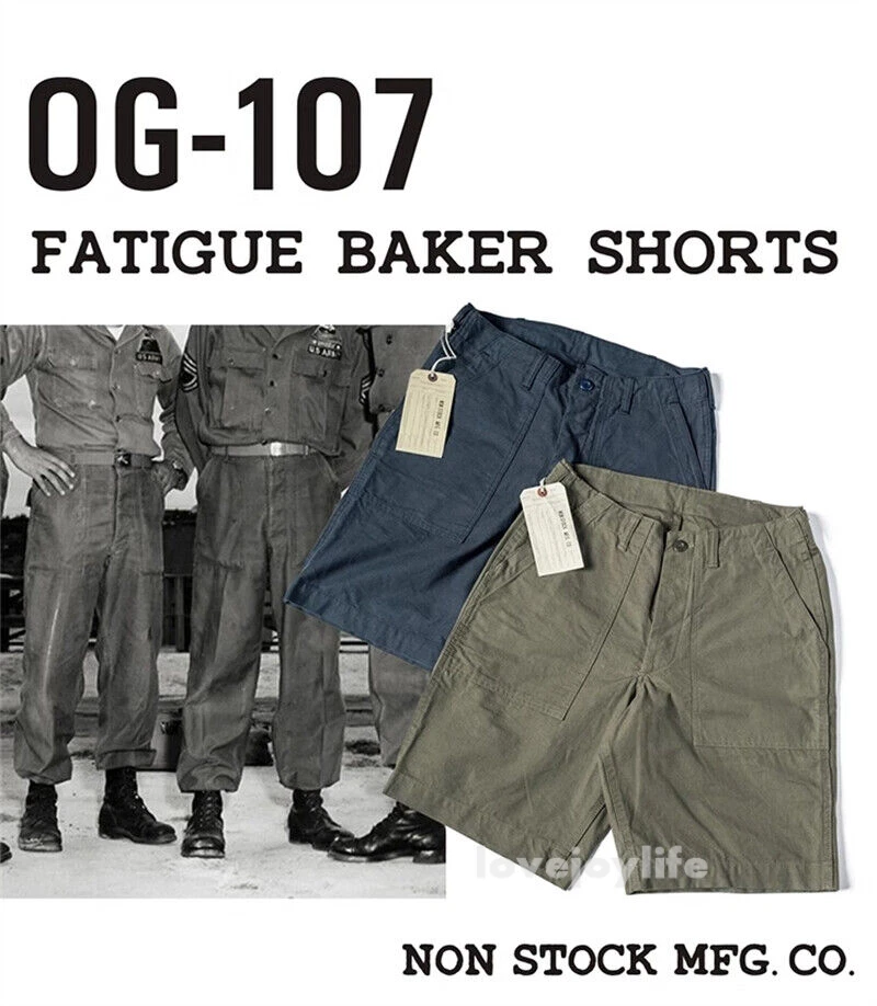 Non Stock OG-107 Baker Shorts Utility Fatigue shorts Cotton Twill Cargo Shorts For Men Based on the vintage OG-107 (Olive Green shade 107) pants Made using 10-ounce, 100% cotton twill, and cut with the reverse side facing outward to give the shorts a more structured silhouette Button fly closure, ensuring a secure fit and easy wear Two front slash pockets and two rear flap pockets with button closures Adjustable waist tabs for a personalize d fit Two colorways - authentic olive green and versatile navy blue Boasts a classic, relaxed silhouette suitable for various body types Pre- washed, little to no shrinkage to be expected Model's 179cm tall and wearing the Small