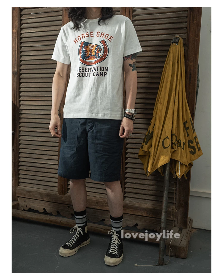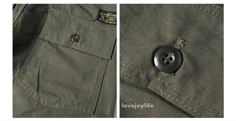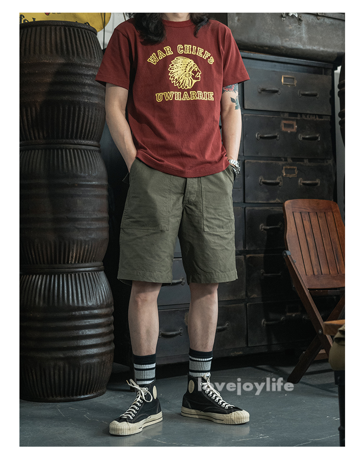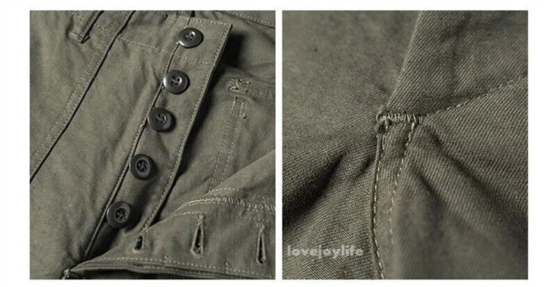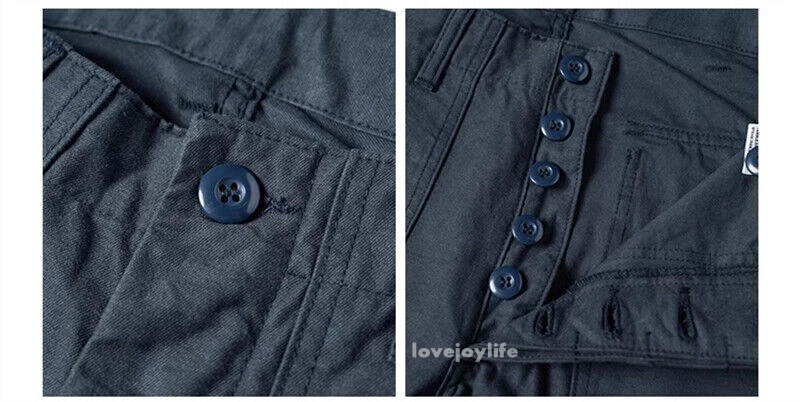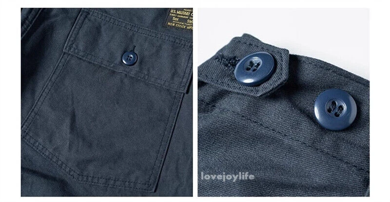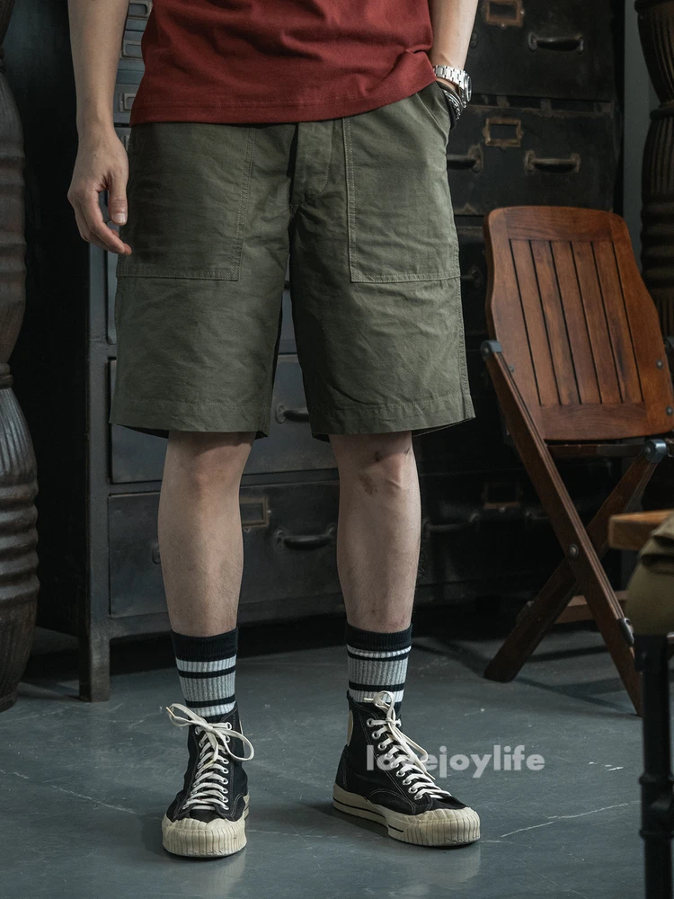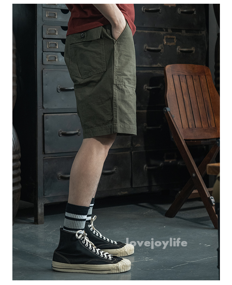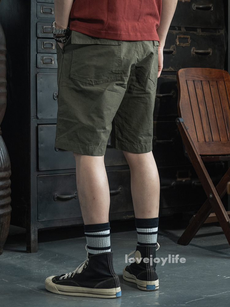 Non Stock OG-107 Baker Shorts Utility Fatigue shorts Cotton Twill Cargo Shorts For Men Based on the vintage OG-107 (Olive Green shade 107) pants Made using 10-ounce, 100% cotton twill, and cut with the reverse side facing outward to give the shorts a more structured silhouette Button fly closure, ensuring a secure fit and easy wear Two front slash pockets and two rear flap pockets with button closures Adjustable waist tabs for a personalize d fit Two colorways - authentic olive green and versatile navy blue Boasts a classic, relaxed silhouette suitable for various body types Pre- washed, little to no shrinkage to be expected Model's 179cm tall and wearing the Small