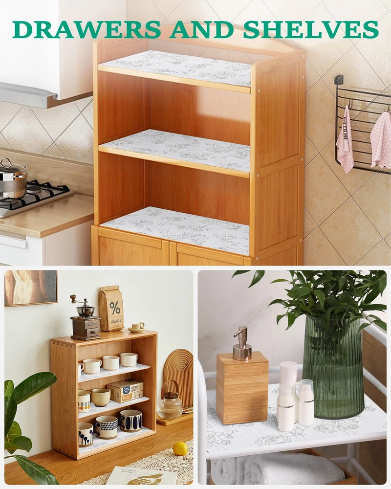 QUALITY AND DURABILITY: Our drawer cabinet liner is thicker, tear-resistant, soft material, has a slight "padded" quality, non-curling edges, durability, and it can be reused, is the great liners to protect surfaces from dust, dirt, and scratches STRONG GRIP: Our drawer liner has a stylish geometric pattern on the top, the other has soft foam anti-slip design that has a slightly cushioned feel to it. And this design offers a double non-slip that keeps them from slipping and keeps in place EASY TO USE: Our drawer cabinets are functional and pretty, the soft material allows the liners to flat against your shelving or drawers. Non-adhesive, won’t worry about leaving residue. It is perfect for home use, also the best choice for renters EASY TO CLEAN: The smooth surface of this drawer cabinet is designed to act as a great waterproof, just washable, or wipe with a damp or dry cloth or paper, keeping a clean, new surface MULTIFUNCTIONAL LINERS: In addition to lining your shelves and drawers, the liners can be used for cabinets, wire shelves, tool storage cabinets, under the sink, and in the laundry room, ensuring that the furniture is long-lasting and as good as new