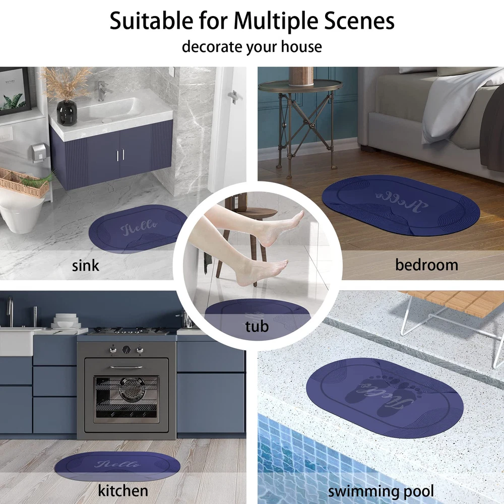 Absorbent & Quick Dry: The 3.5mm thickened soft diatom mud layer has better water absorption. With many small holes inside, this mat can speed up the penetration and evaporation of water, increase the surface to the air and make wet footprints disappear magically in just a few minutes. Super Non-slip Bottom: The anti-slip rubber backing has a special texture, which can firmly fix the bathroom mat on the wet floor and avoid accidents. Washable & Dirt Resistant: The mat is machine washable. It has a smooth surface and super easy to clean. You can get it clean with the shower head and make it like new. Soft Touch & No Shedding: The surface of the mat is made of high-quality faux suede fabric, which is soft and comfortable to keep your bare feet warm even in cold weather. Unlike plush floor mats that contain a lot of microfiber, this product does not shed lint everywhere. Suitable for multiple scenes: This Hello doormat can be used not only in the bathroom, but also on the front door, entryway, stairs, patio, laundry, balcony, kitchen or any area where it can be used to decorate the house and greet guests.