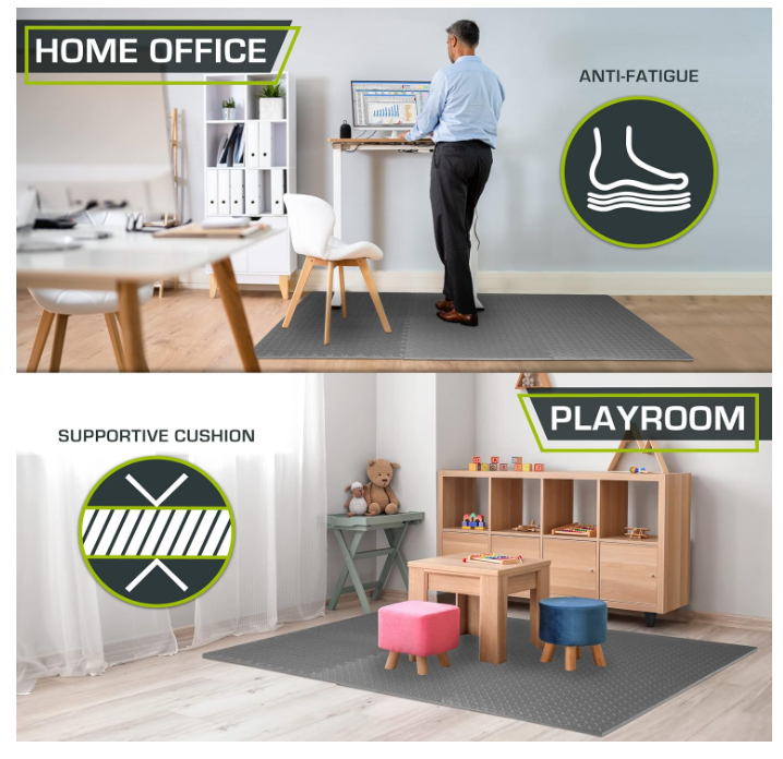 Exercise Mat, Foam Floor Tiles for Home Gym, Mat for Home Workout Equipment ABOUT THIS ITEM: Protective Exercise Flooring - Durable, non-skid textured squares and tiles that cover and protect your floor or even carpet while creating a comfortable workout room with exercise accessories or as a play mat for children. Easy Assembly – Lightweight interlocking foam tiles connect quickly and easily and can be disassembled just as simply for quick storage Versatile – The water-resistant, noise-reducing design is easy-to-clean, great for indoor purposes like in garages as a protector, gyms, a home fitness room, or even children’s play areas as a playmat. Covers 24 Sq Ft - Each Tile measures 24 in x 24 in x ½ in - thick from the highest point of the texture; Includes 6 tiles with end borders for a polished look. Care: Apply warm water and dish soap with a soft cloth or towel and air dry. High Quality Foam - High-density EVA foam mat provides excellent support and cushion; Contains NO toxic phthalates. Excellent alternative to rubber gym mats. SHIPPING: We offer FREE shipping on all orders! We ship within Three business days of payment, usually sooner. We use a selection of shipping services such as UPS, FedEx, USPS etc. We only ship to the lower 48 states, no APO/FPO addresses or PO Boxes allowed. Local pickups and combined shipping options are not provided at this time. PAYMENT: We accept payment by any of the following methods: PayPal Please pay as soon as possible after winning an auction, as that will allow us to post your item to you sooner! FEEDBACK: Customer satisfaction is very important to us. If you have any problem with your order, please contact us and we will do our best to make you satisfied. Thank you for shopping with us!
