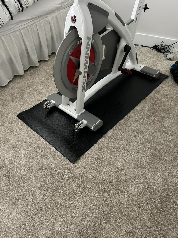 S - 51L x 23.5W x 0.16H in Non-Slip Home Gym Mat – Workout Floor Protection Foam Pad for Treadmill, Bike, Elliptical, Yoga and Exercise Equipment 【HEAVY DUTY PROTECTION】Safeguard your equipment and floor with our heavy-duty, high-density EVA foam mat. Maintain optimal equipment condition and absorb vibrations to prevent scratches on fitness equipment and floor surfaces. 【VERSATILE USAGE】 Crafted with high-density EVA foam material, our stationary equipment mat offers exceptional comfort and durability. Ideal for yoga, Pilates, aerobics, and stretching. 【WATERPROOF & HYGIENIC】 Sweat without worries on this easy-to-clean and waterproof surface. Simply wipe it down after each use for hassle-free maintenance. 【UNIVERSAL FLOOR PROTECTION】 Designed for use on various hard surfaces, including wood, stone, tile, and concrete, our 4.2 mm thick foam mat acts as a reliable barrier 【NON-SLIP SURFACE】 Enjoy enhanced stability during workouts with the slip-resistant textured rubber surface, keeping your stationaries securely in place. 【COMFORT CUSHIONING】 The high-density EVA foam delivers unmatched cushioning and stability, allowing you to perform various exercises with confidence and comfort. 【LOW MAINTENANCE】 Our mat is water-resistant and sweat-resistant, making it effortless to keep clean. Simply wipe it down with a damp cloth after each use, ensuring a fresh and hygienic surface for your next workout. Material Polyvinyl Chloride Foam,Ethylene Vinyl Acetate,Rubber Product Care Instructions Hand Wash Only Product Dimensions 51"L x 23.5"W x 0.16"Th Item Weight 1.7 Pounds