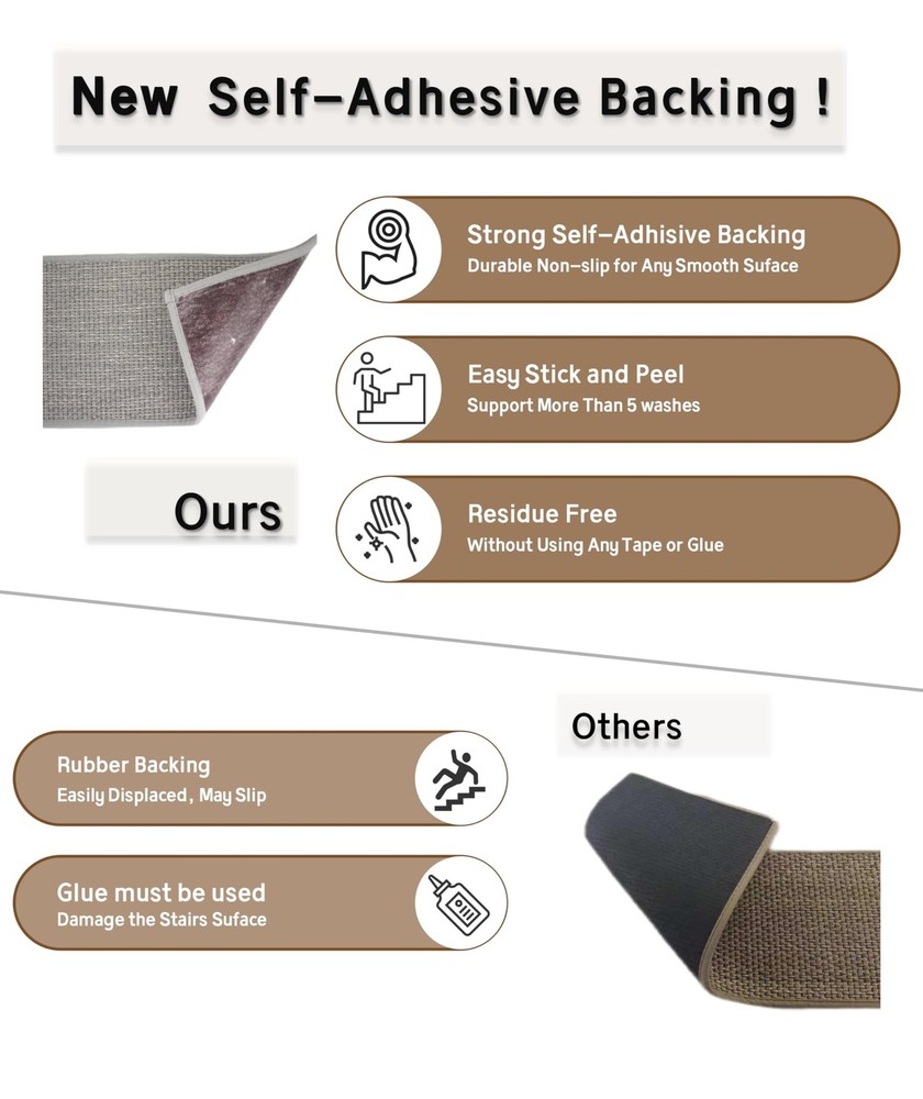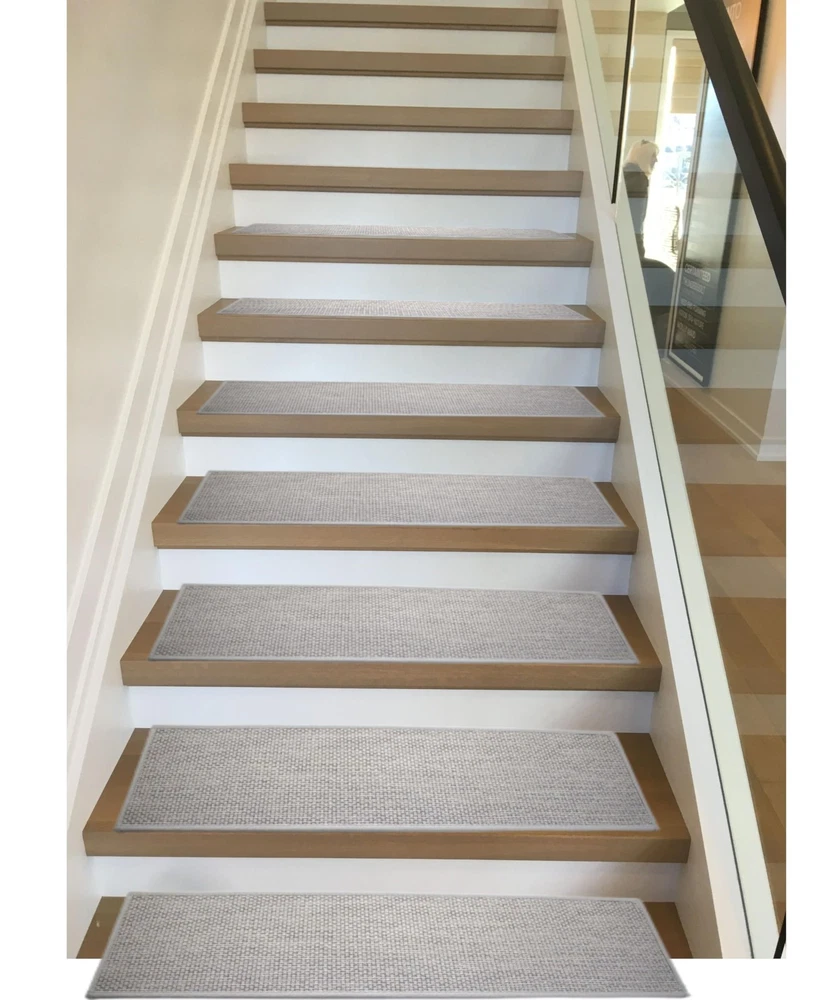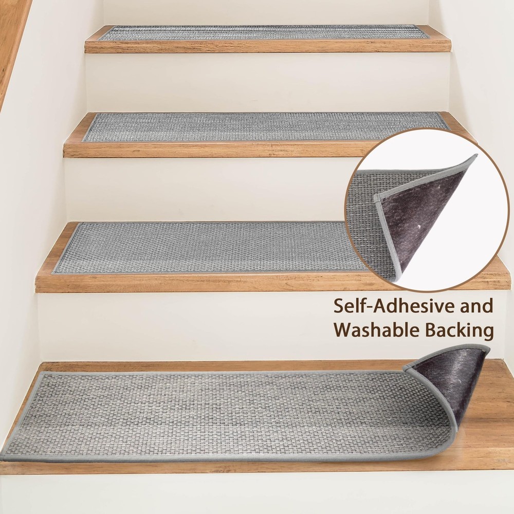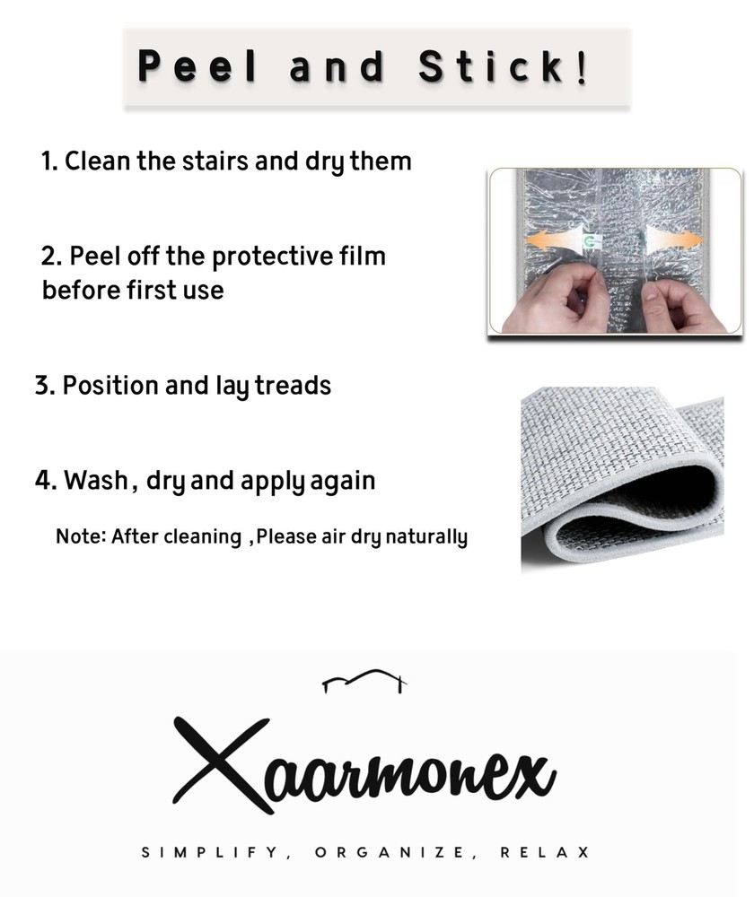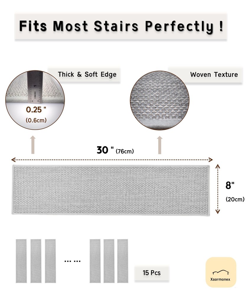 Natural Linen Stair Treads for Wooden Steps, 15 Pcs 8" x 30",Non Slip Stair Runner, Peel and Stick Carpet Indoor for Kids Elders and Pets (15, Grey, 8" x 30") Product Details Size: 8" x 30" Color: Grey Number of Items: 15 Brand: Xaarmonex MPN: NSTL UPC: Does not apply EAN: Does not apply Material: polyester Brand: Xaarmonex Item dimensions L x W x H: 30 x 8 x 0.25 inches Color: Grey Shape: rectangular Product Dimensions : 30 x 8 x 0.25 inches; 6.39 Pounds Item model number : NSTL Date First Available : November 26, 2024 Manufacturer : Xaarmonex Country of Origin : China Best Sellers Rank: #42,767 in Tools & Home Improvement (See Top 100 in Tools & Home Improvement) #85 in Staircase Step Treads #85 in Staircase Step Treads Customer Reviews: 4.4 4.4 out of 5 stars 39 ratings Strong Self-Adhesive BackingStrong adhesive ensures stair treads stay securely on wood, tile, and marble surfaces without shifting or lifting. Peel and Stick, Easy InstallationClean, peel, and stick for quick setup. Removal the Steair Runners leaves no residue, preserving the stairs' finish. Natural Linen Mat: Quiet, Soft & ComfortableCrafted from natural linen, these treads provide a soft feel and reduce noise for a tranquil home. Easy to Clean & Machine WashableVacuum daily or machine wash as needed. Durable design maintains non-slip carpet performance and looks over time.For more lasting, please air dry naturally after cleaning, do not use the dryer! Long-Lasting & Easy maintenanceEach 8" x 30" tread comes in a set of 15, perfectly sized to cover most standard staircases. Easily clean stains with a vacuum, keeping the covers fresh and like new even with long-term use.