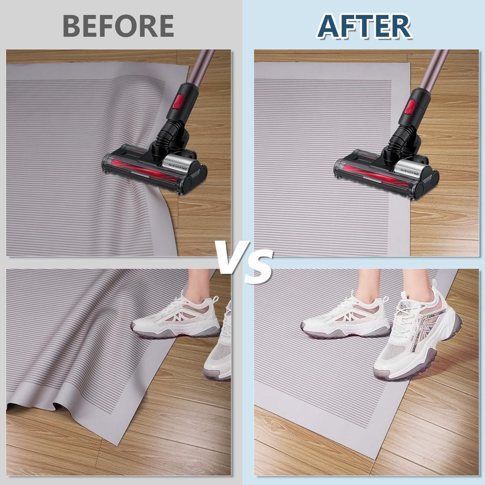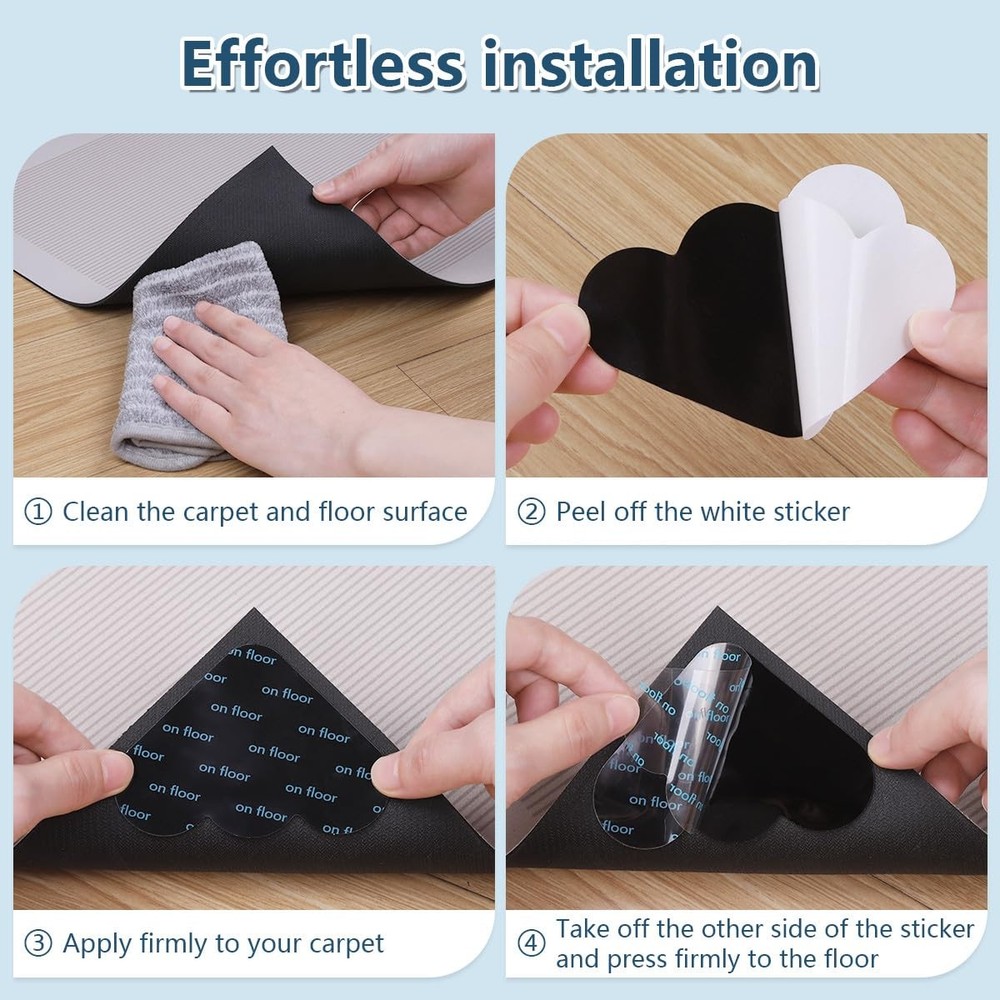 INNOVATIVE TRIANGLE DESIGN: These rug gripper for hardwood floors feature a triangle design with strong double-sided adhesive, increasing kitchen rug contact area and grip. The rug tape hardwood floor no damage ensures rugs fit securely. PREVENTS CURLING AND SLIDING: The rug corner grippers use anti-slip technology to keep rugs steady. The rug stickers for wood floor prevent sliding, ensuring carpets stay in place. These rug gripper for carpet also prevent bunching, keeping rugs neat. WASHABLE AND REUSABLE: The non slip rug grippers are made of PU adhesive, allowing repeated washing with water. Rug grip are easy to remove without residue. For lint-backed rugs, heat the rug corners to hold rug down before removal to soften glue. EASY TO USE: Install our carpet stickers for area rugs by peeling the adhesive backing, attaching it to the carpet, and pressing it firmly. Then secure the rug gripper for tile floors to the floor. Ensure clean surfaces before use for optimal performance. WIDELY APPLICABLE: Our carpet grippers for hardwood floors work on wood, tile, marble, and smooth carpets. The rug stoppers to prevent sliding are versatile for doormat,kitchen,bedroom rug. Cut these carpet gripper stickers to your desired size and shape. IMPORTANT NOTE: After cleaning, rug sticker must be fully dry before reuse. Rug stopper stickers are not recommended for carpeted floors, jute, or rubber-backed carpets.Because the anti-slip rug grips is sticky, it will pick up the pile SUITABLE KIT: This set of rug anchors includes 10 pieces, ideal for customizing your rug placement. Our corner rug grippers is only 0.04 in thick.The durable rug slipping grippers ensures carpets stay secure and enhances room aesthetics.