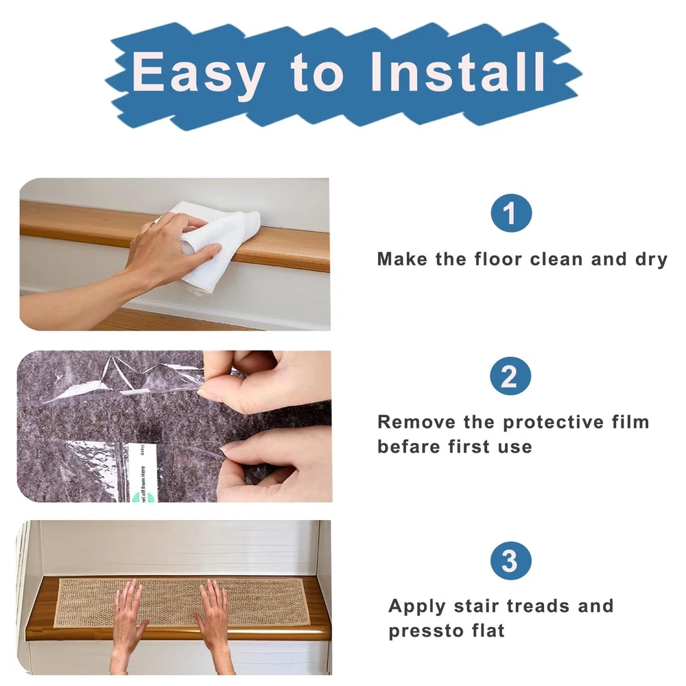 Stair Treads Non Slip for Wooden Steps, Carpet Stair Treads 15 Pack 8'' x 30'', Stair Runner Indoor, Machine Washable for Kids, Elders, and Dogs, Beige Product Details Size: 30"L x 8"W Color: Beige Number of Items: 15 Brand: Zreolity MPN: Stair Treads Non Slip-beige UPC: Does not apply EAN: Does not apply Material: Polyester, Natural Linen Brand: Zreolity Item dimensions L x W x H: 30 x 8 x 0.3 inches Color: Beige Shape: Rectangular Product Dimensions : 30 x 8 x 0.3 inches; 6.48 Pounds Item model number : Stair Treads Non Slip-beige Date First Available : November 26, 2024 Manufacturer : Zreolity Country of Origin : China Best Sellers Rank: #362,191 in Tools & Home Improvement (See Top 100 in Tools & Home Improvement) #589 in Staircase Step Treads #589 in Staircase Step Treads Customer Reviews: 4.4 4.4 out of 5 stars 10 ratings These non slip stair treads indoor are designed with premium grip backing to prevent shifting or slipping on wood, marble, or tile surfaces. They work as reliable anti slip mats, making your home safer and friendly for kids, pets, and elderly family members. Easy Installation: Featuring strong adhesion, our self-adhesive stair treads are easy to installjust clean, peel, and stick, with no tools required. These stair treads for wooden steps indoor are also easy to remove or reposition without leaving residue. Easy to Clean and Long-Lasting: Made of durable polyester, these carpet for stairs are both vacuum-friendly and machine washable. Ideal for long-term use, our stair covers for wood stairs maintain a clean and fresh appearance with minimal effort. Noise-Reducing and Comfortable: Enjoy a quieter home with our soft, cushioned carpet stair treads for wooden steps that help reduce noise and absorb impact. These comfortable stair carpet runner mats are perfect for busy, multi-level households Versatile Decor: Removable stair runners for wooden steps set of 15, Measuring 8" x 30", they fit most indoor stairs. These non-slip stair treads combine style and practicality, they effortlessly complement any decor, adding both safety and elegance to your home
