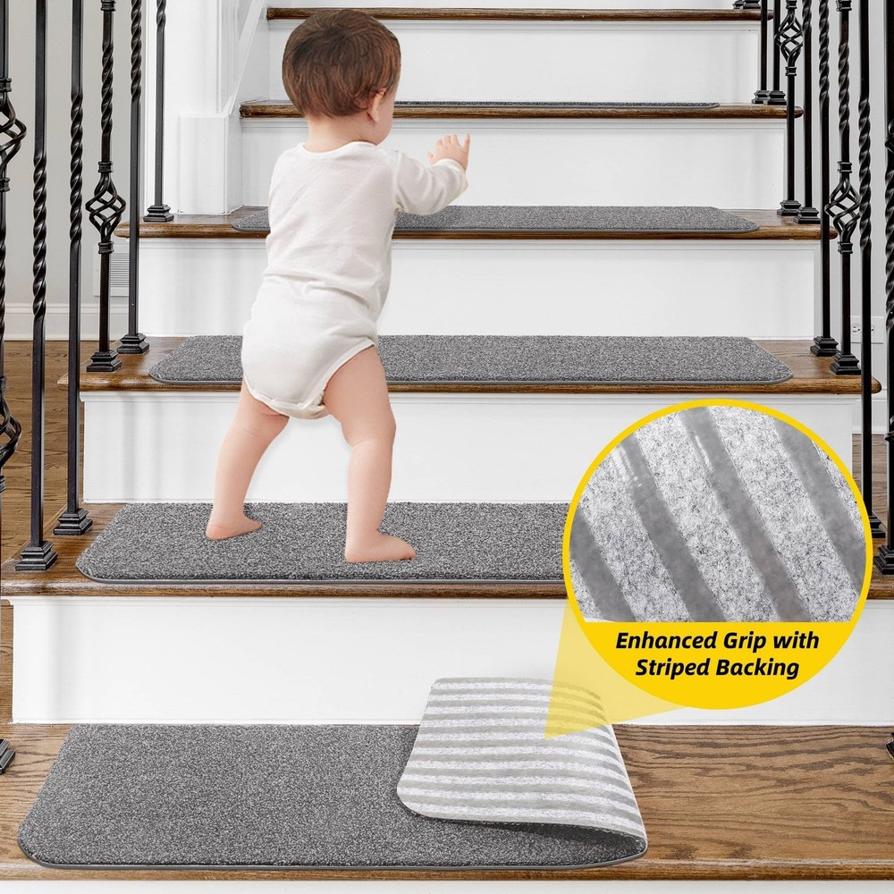 Non-Slip Stair Treads for Wooden Steps Indoor, 15 Pack 9" X 28" Stair Carpet Mats with TPE Backing for Kids Elders and Dogs, 0.3" Thick 100% Polyester Soft Stair Runner Rug, Light Grey Product Details Size: 28''x9'' Color: Light Grey Number of Items: 15 Brand: JSEI MPN: HLE-7779 UPC: Does not apply EAN: Does not apply Material: Polyester Brand: JSEI Item dimensions L x W x H: 28 x 9 x 0.3 inches Color: Light Grey Shape: Rectangular Item Thickness: 0.3 Inches Item Weight: 7 Pounds Number of Items: 15 Product Dimensions: 28 x 9 x 0.3 inches Item Weight: 7.03 pounds Manufacturer: JSEI Country of Origin: China Date First Available: January 21, 2025 Anti-slip Strips Enhance Safety: These multi-purpose stair rugs feature a TPE anti-slip backing and built-in anti-slip strips to provide superior grip on dry floors, preventing slipping and protecting the surface from wear and tear. Our premium wooden stair mats help your kids and dogs go up and down the stairs easily without worrying about slipping. Freely Cut to Fit: These non-slip stair tread carpets for wooden stairs can easily cut these stair treads to the size you want to match your corners or special step lengths. Our stair carpets are made with high-stability crease technology, so you don't have to worry about delamination.They stay firmly in place, even when wet. Genuine Material, Superior Quality: The surface of this non-slip stair tread mat is made of 100% polyester material, which is soft and wear-resistant. It is durable and not easy to pull and pile up. The appropriate thickness not only ensures that you can step on our stair tread carpet comfortably, but also helps keep your feet away from the cold stairs. Reduce the noise of going up and down the stairs, giving your family a quiet and relaxing environment. Easy to Remove and Clean: If you need to reposition or remove the stair treads, it will not leave any residue, protecting your original stairs from damage. When the stair carpet gets dirty, just vacuum the hair and stains. Or throw the stair carpet treads into the washing machine. After washing in water, it is recommended to dry in the shade, not in the dryer or in the sun. Works on Any Stairway: Our stair treads for wooden steps measure 9"x28", the stair mat adopts a clean solid color design suitable for any indoor stairs that are made of wood, laminate, marble, tiles, glass, etc.