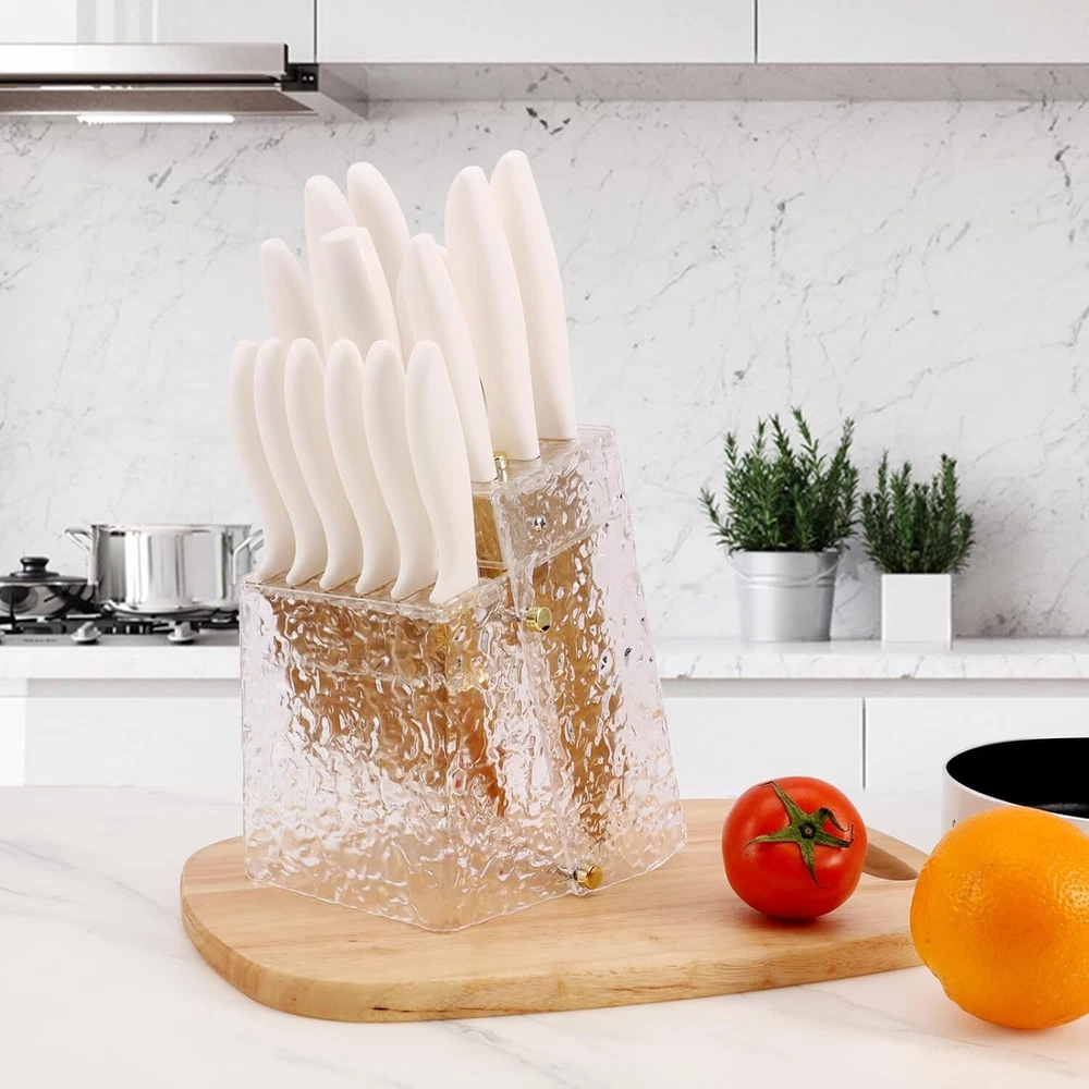 Product Description Kitchen Knife Set Non Stick Knives Set with Block Cutlery Knife Block Sets, Serrated Steak Knife, Scissors and Sharpener, 15Pcs Stainless Steel Chef Sharp Quality with Gold Blade for Home & Pro Use A Knife Set for Your Cutting Needs - - This 15 Pieces knife set includes 1x 8" Santoku Knife 1x 8" Chef Knife 1x 8" Carving Knife 1x 8" Bread Knife 1x 3.5" Paring Knife 1x 5" Utility Knife 1x Sharperer 1x Kitchen Shears 6x Steak Knives 1x Knife Block. All the cooking knives you need in one pack. High-Quality Material to Cutting Items - - This stainless steel knife is made of stainless steel, doesn’t contain any heavy metals and chemical elements. It will not react chemically with food, leave residue or emit an odor when used, allowing food to retain its original flavor and freshness for longer. Non Stick Forging & Hammering Texture and Thick Knife Blade Design - - Unique Forging & Hammering Texture Knife Blade makes this knife nonstick,and easy to maintain. Our tough stainless steel knives are not only sharp, also lightweight, comfortable to hold, and easy to grip. Easily cut anything (such as meat, bread, fruits, and vegetables) and let you enjoy the fun of cooking. Colors Optional & Ideal Gift - Our knife set will come with a stand that is beautiful and space-saving. Makes it easy for you to pick up the knife you need. Colors for you, Perfectly adapted to all kinds of kitchen styles. Also can be a great gift option for family and friends on birthdays, weddings, anniversaries, housewarming days, etc. Easy To Clean - - After using the kitchen knife set, simply rinse quickly and wipe with a kitchen towel, (Take care when cleaning to prevent cutting fingers). It’s an essential and practical kitchen cutting tools, by the way if became dull after using for many times you can sharp it with a sharping. About Us We are a reputable seller with many years of experience selling on eBay. Our goal is to provide high-quality products and excellent customer service. Shipping Items will be shipped within 1-3 business days when we received payment. (Orders are not processed on weekends & holidays) Tracking information will be sent once item is shipped. Delivery time depends on destination and other factors Item is shipped to ebay address. Leaving correct address can minimize delay. For international shipping and shipping to Guam, Hawaii and Alaska, Please contact us before placing the order. International buyers please note: Import duties, taxes and charges are not included in the item price or shipping charges. These charges are buyer’s responsibility. We will try our best to reduce the risk of the custom duties. Local pick-up is unavailable at the moment. Contact Us We reply any email messages within 1 business / working days(off-duty at weekend). If you do not get a response from us, then please check your junk or spam mailbox. Our Business hours: Mon-Fri 9:00-18:00, UTC/GMT +8 hours. Please contact us either by clicking "contact seller" in the "purchase history" section or simply click "ask a question" at the bottom of this page. If you are unsatisfied with our item or service, please contact us before leaving any feedback. We are committed to resolve all issues in a friendly and satisfactory manner.