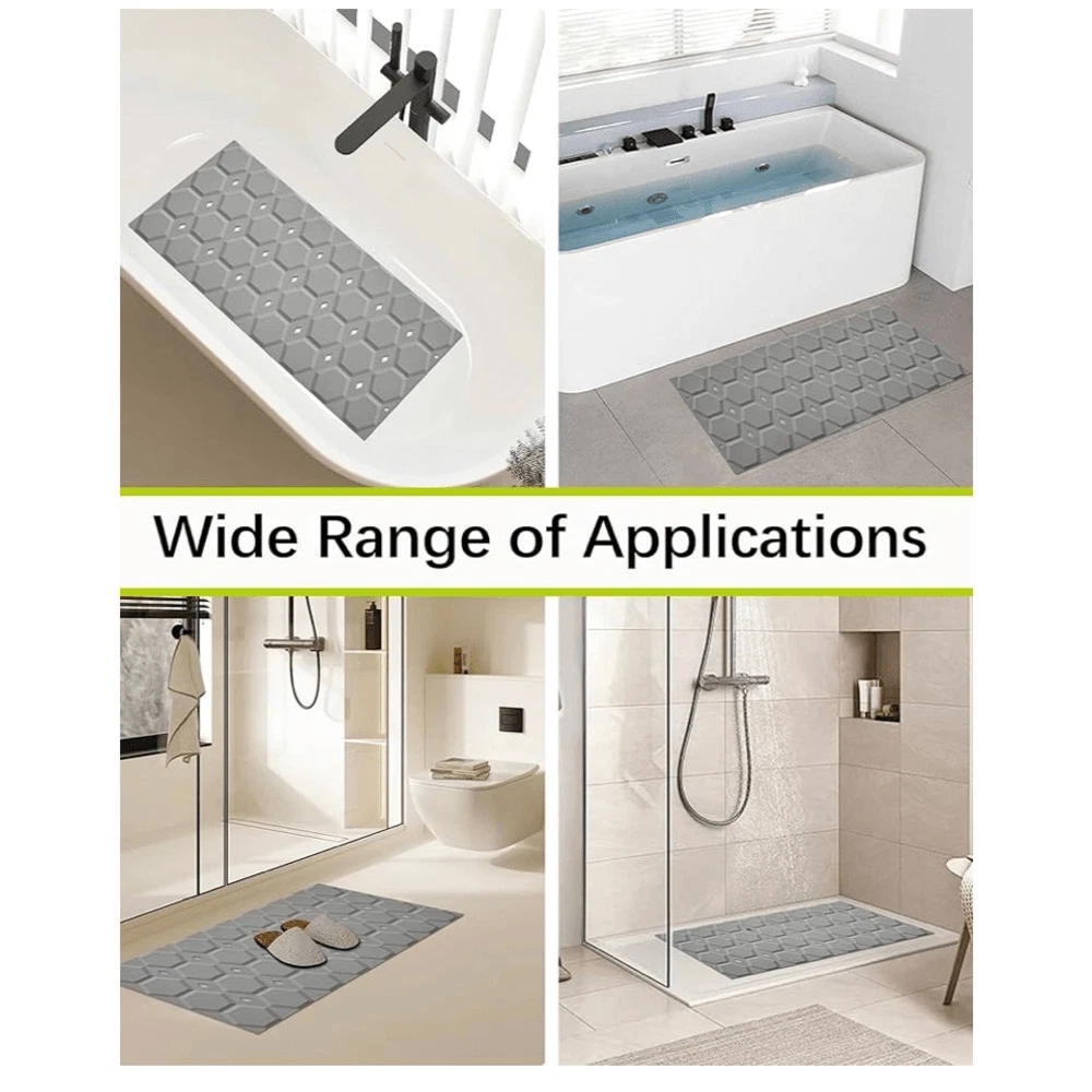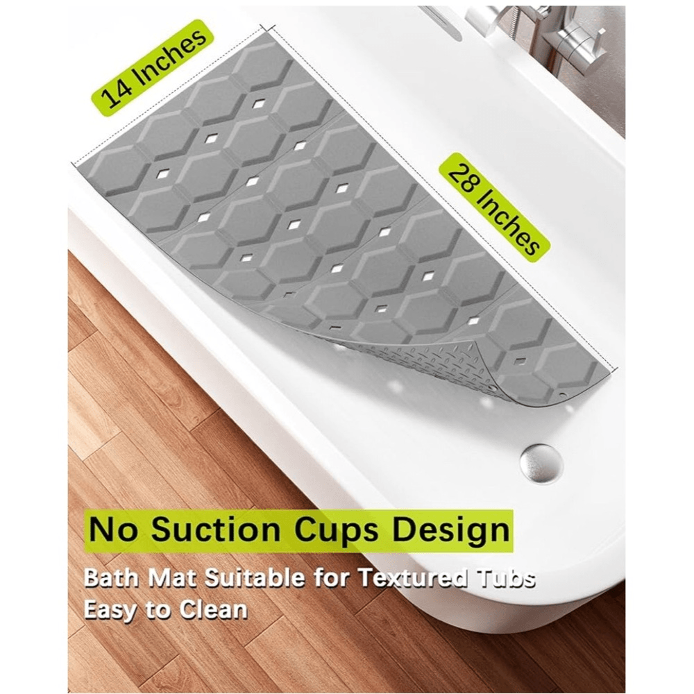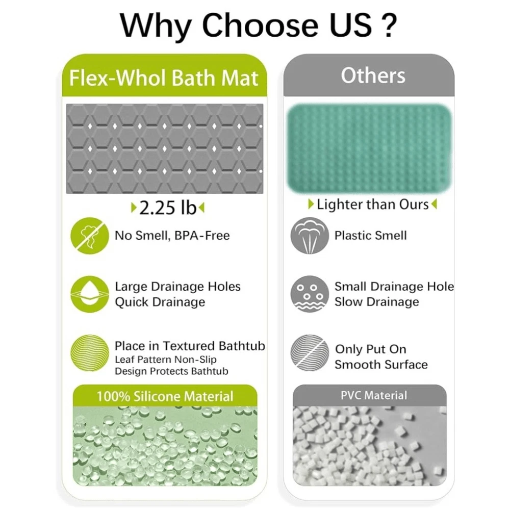 【Non-Slip Bathtub Mat】Flex-Whol bathtub mat back with non-slip leaves pattern design, without suction cups, which also increases friction with the bottom of the tub. When bathing, for the elderly, children and adults using anti slip shower mat can reduce the risk of slipping 【Safe and Durable to Use】Our non-slip bath mat is made of silicone material, it's soft, comfortable, BPA-Free, safe, odorless, durable. Tub mat is foldable space saving, also convenient to travel to carry out. The surface of the tub mats non slip is made up of hexagons and non-slip texture. Gives bathers a pleasant touch and enhances bathing comfort 【Bathtub Mat Size】Shower Mats size 28 x 14 Inch, can be used in most bathtubs or used inside the bathroom. Not only can it be used inside the bathtub, but also beside the bathtub, shower floor, and so on. Shower mat suitable for non-smooth, textured, clean surfaces 【Quick Drain】Shower mats for inside shower has large diamond shaped drainage holes so that the suds and water can drain away quickly. Drainage hole back and hanging hole back have edge wrapping design to make tub bath mat more durable and less prone to damage and breakage 【Easy to Clean】After bathing, rinse with water and hang by the bathtub to dry.And also machine washable, wash it gently with cold or lukewarm water, can not machine dry it, dry it in a draught place. WARNING: Do not jump on the bath mat - may cause slipping