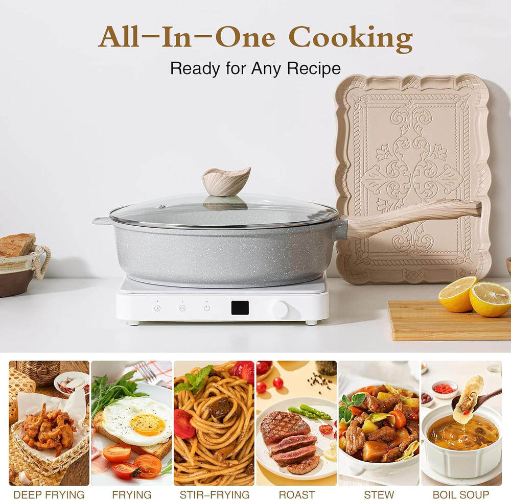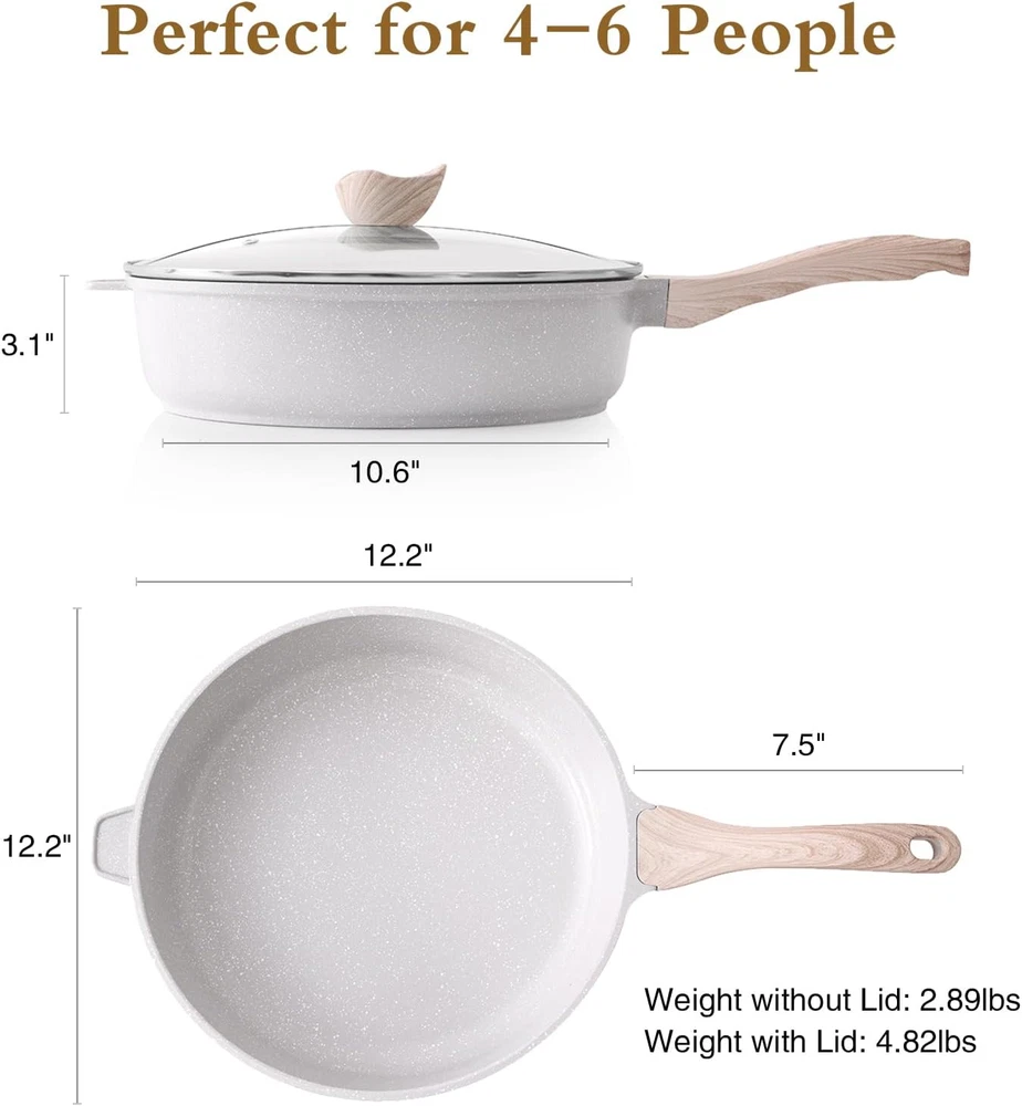 【Premium Ceramic Coating】: Our nonstick frying pan features a safe and healthy ceramic coating, SGS approved, and free from PFOA & PFAS ; enjoy effortless cooking with minimal oil for a healthier diet; the ceramic non-stick coating ensures a smokeless and safe cooking experience; 【Effortless Cleaning】: Cleaning up is a breeze with our non-rivet construction and non-stick coating; simply wipe the ceramic pan with a sponge and warm soapy water, or toss it in the dishwasher for even more convenience, maintain a clean and pristine pan effortlessly; 【Versatile Saute Pan with Lid】: Experience the convenience of our 12" diameter, 3.2" height, and 5 quarts capacity ceramic cookware; this large and deep skillet, also functioning as a deep frying pan and induction frying pan, is perfect for stir-frying, frying, boiling and deep-frying a variety of dishes with ease 【All Stove Compatible with Advanced Technology】: Our saute pan is designed with a high magnetic stainless steel base that works on all cooktops, including induction; its advanced die-casting aluminum technology ensures anti-warping, quick and even heat distribution, saving you time and energy in the kitchen; 【Detachable Wood Handle & See Through Lid】: Enjoy added convenience with the detachable woodgrain bakelite handle, allowing for easy storage and oven use; it is comfortable to grip and ergonomic, and keeps it cool during cooking; the see through glass lid allows you to check cooking progress while locking in flavor; Product Description 1 All Stoves Compatible 2 Non-Stick Surface 3 Easy to Clean Professional Cookware, Cooking Made Easy! Lock in Steam and Flavour See-Through Glass Lid Helps you to easily see changes in ingredients and keep track of the heat during cooking without interrupting the cooking process. The lid is airtight and locks in the heat inside the pan, preventing loss of steam and aroma. Elevate Your Cooking Experience High-Rise Edges The added height minimises splattering of oil and food, keeping your cooker and kitchen surfaces cleaner. Perfect for frying chicken, sautéing vegetables or grilling meat. Enhances Stability & Ease of Use Attached Ear Design When the deep frying pan is filled with heavier ingredients, this design helps to balance the weight and reduce the risk of tipping or spilling. Allows you to safely move the deep frying pan from the stovetop to the table or maintain better control when pouring out food. Cool to the Touch & Firm Grip Removable Wood-Grain Bakelite Handle The ergonomically designed handle provides a comfortable grip and allows for easy lifting and precise handling of the deep frying pan. The removable design also provides convenience for storage and cleaning. All-In-One Cooking Pan KORDISEN Cookware Customer Reviews 4.7 out of 5 stars 933 4.6 out of 5 stars 852 4.7 out of 5 stars 321 4.7 out of 5 stars 458 4.6 out of 5 stars 271 4.5 out of 5 stars 118 Price $29.99 $ 29 . 99 $42.39 $ 42 . 39 $67.99 $ 67 . 99 — $33.59 $ 33 . 59 $26.09 $ 26 . 09 Material Ceramic Aluminum Ceramic Ceramic Aluminum Aluminum Dimension 10/11/12inch 12inch 8/9.5/11/12.5inch 1.5QT & 2.5QT 9.5/11inch 10/12inch Easy to Clean ✔ ✔ ✔ ✔ ✔ ✔ Has Coating ✔ ✔ ✔ ✔ ✔ ✔ Detachable Handle ✔ ✔ ✔ ✔ ✔ ✔ Is the non-stick ceramic coating PFOA-free? Yes, the non-stick ceramic coating used on this ceramic deep frying pan is PFOA-free, ensuring safe and healthy cooking. What stovetops is this Ceramic Deep Frying Pan compatible with? This ceramic deep frying pan is compatible with a wide range of hobs, including electric, gas, ceramic and induction hobs, ensuring a wide range of suitability. Can it be used in the oven? Our ceramic deep frying pan can be used in the oven, but please remove the handles when using the oven, which is oven safe up to 550°F (without the handles). Is the handle removable? Yes, the handle is removable. You can use the screwdriver included in the package to detach it easily. How do I care for its non-stick ceramic coating to ensure its longevity? To maintain the deep frying pan's non-stick ceramic coating, avoid using metal products that will scratch the surface. Silicone and wooden spatulas are recommended. When cleaning, hand washing with a soft sponge and mild detergent is recommended.