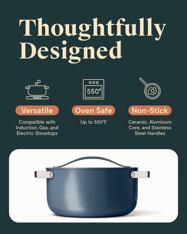 NOW LIVE ON AMAZON: has officially launched their best-selling and consciously crafted cookware on Amazon for everyone to enjoy. Time to upgrade your pots and pans and spruce up your kitchen decor! 6.5 QUART DUTCH OVEN: Your new best friend for pastas, roasts, stews, bread baking, and more. This durable non-stick pot makes cooking easier than ever, cleaning (dare we say) enjoyable, and adds a pop of color to any home. NATURALLY NON-STICK: Our naturally slick non-stick pots and pans require less oil or butter for cooking and minimal scrubbing for a spotless clean, giving you a healthier and more enjoyable at-home cooking experience. NON-TOXIC COATING: All pot and pan products are free of PTFE, PFOA, PFAS, lead, cadmium and other toxic materials that can leach into your food, making them safe for you, your family and the environment. SIMPLE CARE: Our cookware ais made for any kitchen and cooktop. Use them on low to medium heat and add a dash of oil or butter for an effortless glide. Our cookware is also oven-safe up to 550ºF.