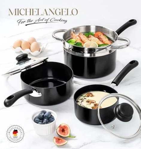 Premium Stainless Steel Steamer & Non-Stick Saucepan Set Steamer Features: Constructed from healthy, durable 304 stainless steel for long-lasting use. Dual handles ensure secure handling and easy maneuverability. Grooved base snap-locks onto your 3QT ceramic pot, preventing spills during use. Ideal for steaming grains, pastries, vegetables, eggs, and seafood. Perfect for preparing healthy breakfasts, lunches, and dinners. Super Easy to Clean: Excellent nonstick saucepan with lid simplifies your cleaning process. Quick rinse with soapy water after use keeps the saucepan looking like new. Superior Non-Stick & Perfect Size: Saucepan equipped with a health-conscious ceramic coating, free from APEO & PFOA. Available in 1-quart, 2-quart, and 3-quart sizes, perfect for everyday use. Fast & Even Heating: Nonstick pot features a durable aluminum alloy base for enhanced heating performance. Compatible with all stovetops and dishwasher safe for added convenience. Ergonomically Designed Lid & Handle for Convenience: Multi-purpose cooking pot set includes a heat-resistant glass lid for easy food monitoring. Saucepan locks in flavor and nutrients for healthier, tastier meals. Long handles designed for comfort and safety, staying cool and providing a firm grip. Handcrafted and double-riveted for added durability.