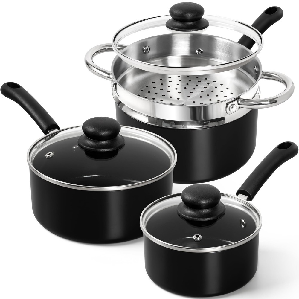 Premium Stainless Steel Steamer and Non-Stick Saucepan Set Steamer Crafted from Healthy, Durable 304 Stainless Steel - This steamer is designed with dual handles for secure handling and a grooved base that snap-locks onto your 3QT ceramic pot, preventing spills during use. Perfect for steaming grains, pastries, vegetables, eggs, and seafood — ideal for healthy breakfasts, lunches, and dinners. Super Easy to Clean - Our excellent nonstick saucepan with lid simplifies your cleaning process with its superior performance. Just a quick rinse with soapy water after use, and the saucepan looks like new. Superior Non-Stick & Perfect Size - The saucepan is equipped with a health-conscious ceramic coating, free from APEO & PFOA. Our saucepans come in 1-quart, 2-quart, and 3-quart sizes, perfectly suited for everyday use. Fast & Even Heating - The nonstick pot in our set features a durable aluminum alloy base that greatly enhances heating performance. The saucepans are suitable for all stovetops and are dishwasher safe. Ergonomically Designed Lid & Handle for Convenience - The multi-purpose cooking pot set includes a heat-resistant glass lid for easy food monitoring. The saucepan locks in flavor and nutrients for healthier, tastier meals. The long handles are designed for comfort and safety, staying cool and providing a firm grip. They are handcrafted and double-riveted for added durability.