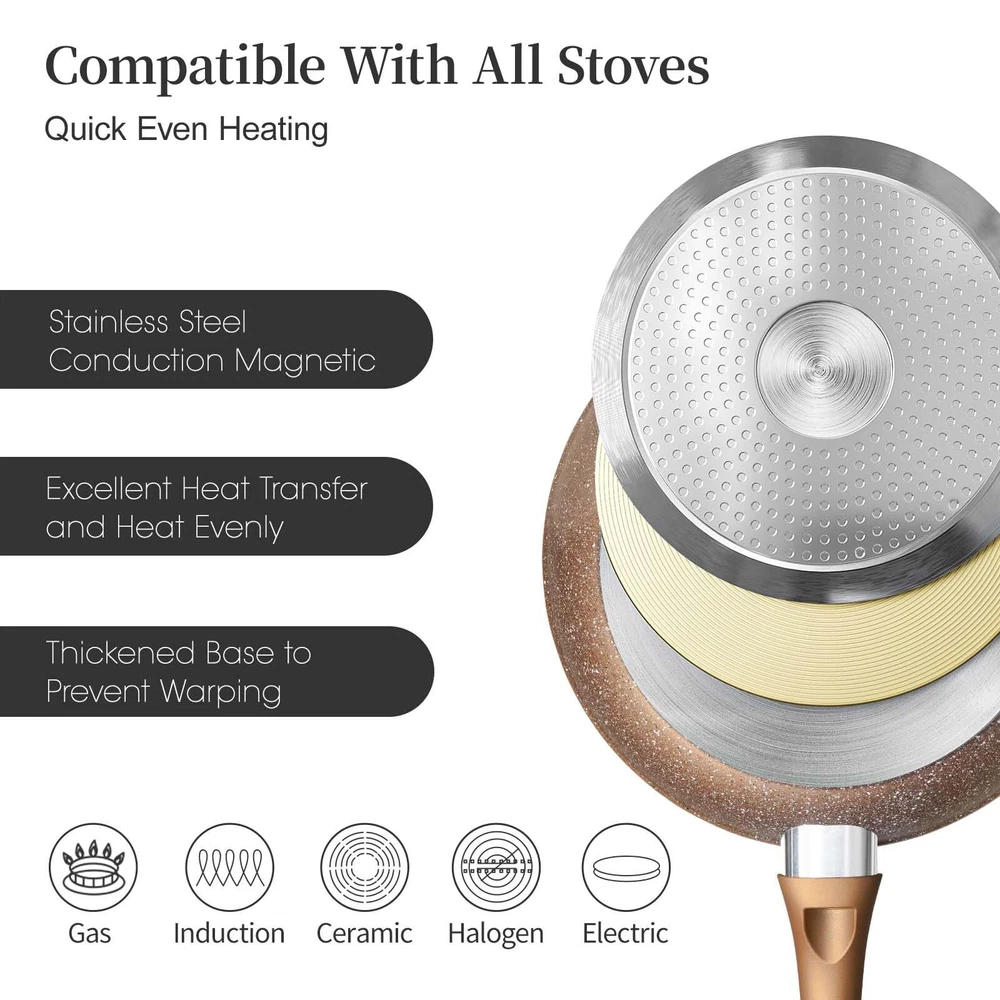 Nonstick frying pan set, set of 3 non stick frying pans, gold granite stone induction cookware, nonstick kitchen cooking pan, healthy and no toxic cookware, lightweight aluminum alloy pots and pans set 【Healthy And Safe Granite Coating】The frying pan set combines the natural texture and durability of marble to create a high quality nonstick cookware set. The non stick frying pans is coated with an imported coating, gets SGS approved, non-toxic, lead and cadmium free, PFOA and PFAS free. The pan set has superior nonstick performance. During cooking, Even if less oil, The foods slide over smoothly from the surface of cookware without effort, Brings us a less oil, smokeless and healthy diet 【3 Piece Non Stick Frying Pan Set】The cookware sets include an 8 inch, 9.5 inch and 11 inch nonstick frying pan. The 8 inch small egg pan, ideal for fried egg, bacon for breakfast. The 9.5 inch omelet pan, perfects for frying steak, salmon fish for lunch, The large skillet pan, perfects for the whole family meals for dinner. This multi frying pan meets all needs of daily life 【Compatible With All Stoves】The interior core of the pans set nonstick is made of professional grade aluminum alloy, the design of widened and thickened bottom, and thickened the wall of pan, ensure the frying pans heats up quickly and evenly, warp-resistance, cooks the authentic delicious foods. The high magnetic conductive stainless steel base used effectively on induction hob, gas stove, electric cooker, glass stovetop and ceramic stove, suitable for any kitchen and cooktop 【Durable Body and Unique Design】The nonstick cookware set has a flat base, the oil doesn't run around, ensures the foods even heat distribution. The frying pan set features a durable five layers structure for super non-stick performance and durability. The ergonomic heat resistant handle offers a better grasp and stay cooling feeling. The stackable frying pan set with hole, convenient for hanging, enough save space for kitchen. The pots and pans set is excellent kitchen essentials for new house 【Easy To Clean】The nonstick frying pan super easy to clean, just wipe the cooking pan over with a sponge with warm soapy water, or rinse it with flowing water, all the mess immediately disappear. Dishwasher safe, but recommend hand wash to protect the nonstick coating. oven safe to 302°F(Remove the handle before use the oven) 【High Quality Service And 】Before sending to , each product must undergo strict multiple quality checks. If there are any defects or damages to the product, please feel free to contact us and to provide you with a 100% satisfactory solution within 12 hours, provide a full 12-month and 30-day MONEY BACK