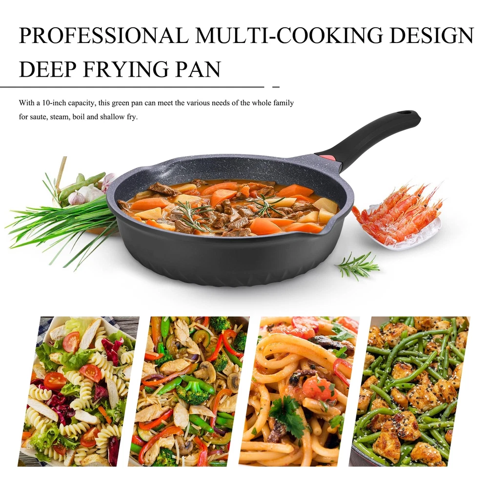 ►(L)Deep Frying Pan, 11 inches in Diameter Whether it’s one’s steak or a family’s delicacy, you can easily cope with it -Fry Pan Diameter: 11.0 inches / 28cm -Fry Pan Height: 5.5 inches /14cm -Total length: 18.5 inches / 47cm ►Trustworthy quality The Aluminum Chef Pan is made of sturdiness die cast aluminum, which is durable, lightweight and refusing to be out of shape. Perfectly matched glass lid with Steam Release Technology creats the perfect oven-like feeling on the inside so as to keep food warm. ►Multifunctional cookware Allows for multi-purpose so you can grill but also stir fry and sauté food. Use as Grill pan, fry pan, sauté pan or as a casserole, an all in one frying pan. And to top it off, our skillets are deeper and have a wider cooking surface, allowing you to sear, bake and fry better. ►3-Layer German Greblon Non-Stick Coating Thanks to its nonstick surface you can flip your food and lift them out of our nonstick pan with ease. So our nonstick pan is ideal for preparing delicate foods such as eggs, pancakes, steaks, fish and more. Another advantage of non-stick pans is that they support cooking with less oil and practice the laws of health from each dish. ►Allow Various Stoves Design makes life more free. non-stick pans are compatible with gas stove, induction stove, electric stove, halogen stove or ceramic stove. Safety and peace of mind. ►Dishwasher Safe 【Anti-Scratch & Safety Coating】High quality German Greblon C3+3 plasma coating, 100% free of any toxins PFOA, GenX, CMX, etc.This non-stick frying pan achieves the perfect balance of safety, elegance and amazing durability.Superior Non-stick interior provides easy food release and cleanup so you can cook with confidence and enjoy delicious meals with Cookware. 【Versatile Saute Pans】Deep frying pans with lids are designed for professional multi-cooking purposes, making omelettes, sautéing steaks, french fries, simmering soups, sautéing vegetables and more with ease. Meet the various needs of the whole family for saute, steam, boil and shallow fry. 【Fume Free Cooking】The ergonomic handle is bakelite and is equipped with a heat sensor, the silicon starts to change color when the frying pan reaches the optimum heat level of 300°F. Keeping vegetables at the right temperature can reduce soot. 【Effective Non-stick, Easy to Clean】German greblon non-stick coating is wear-resistant and non-stick, and frying is non-stick for a long time. No welding, no rivets, stronger pot handles and easier cleaning. 【Gold Medal Quality】diameter 12.4in, depth 3.2in, capacity 5QT, thickness 0.25in. 800 tons of pressure casting, heating evenly. Even continuous heating, the bottom of the pot will not be deformed.
