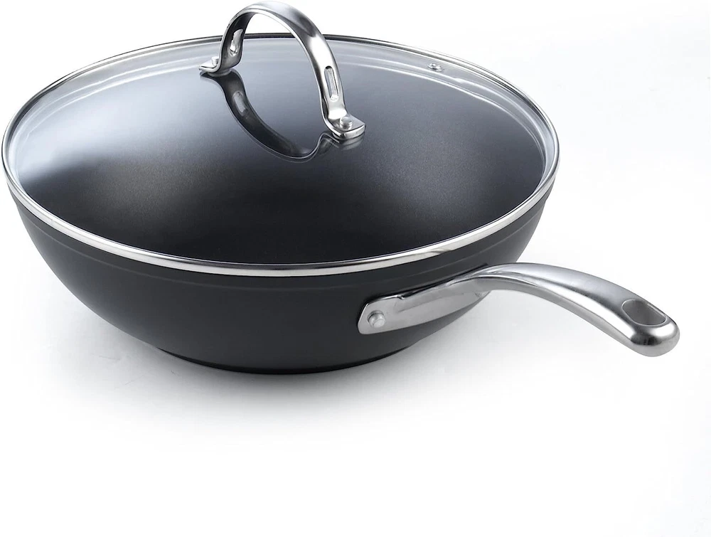 The 11-Inch Hard Anodized Nonstick Wok Stir Fry Pan Flat Bottom With Lid, Black, 28cm has a hard anodized surface that is durable, heats evenly and quickly, and prevents hot spots. Material is harder than steel, thick, and chip-resistant. Nonstick performance for easy food release and tossing, cleaning, and allows for healthy cooking. Tempered glass lid with steam vent is protected by a stainless steel rim to view food. Long riveted stainless steel handle stays cool and comfortable and is strong. Wide and deep to hold a large amount of food for multipurpose use: stir frying, sautéing, frying, and more. Not induction . Works on gas, , glass, ceramic, halogen, etc. Oven safe to 500°F, glass lid to 350°F. Dishwasher safe, hand wash recommended. 【Hard Anodized Surface】Has a hard anodized surface that is durable, heats evenly and quickly, and prevents hot spots. 【Non-stick Performance】Nonstick performance for easy food release and tossing, cleaning, just need to cook with little oil; and allows for healthy cooking by using various traditional cooking techniques like pan-frying, braising, and deep-frying. 【See-Through Lids】Tempered glass lid to view food; wide and deep to hold a large amount for multiple uses. 【Keep Cool Handle and Oven Safe】Long riveted stainless steel handle stays cool and comfortable; oven safe to 500°F, glass lid to 350°F. 【Works on Most Stovetops】 Not induction . Works on gas, , glass, ceramic, etc; hand wash recommended, Given diameter is outer diameter.