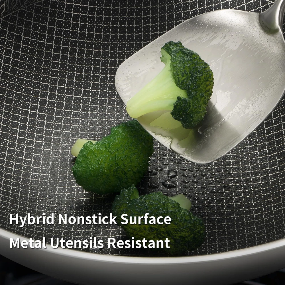 Non-stick Performance: Our 18/10 stainless steel wok has a dotted scratch-resistant non-stick surface. Food won't stick to the bottom of the pan while cooking the dish and it's easy to clean after use. Fast & Even Heating: With tri-ply stainless steel construction, the wok will ensure optimal heat distribution for deep frying, broiling, braising and stir-frying meat and vegetables. Ergonomic Design: The stir-fry pan features a comfortable handle, which can stay cool during cooking. And the tempered glass lid of stir-fry pan will also let us see our dishes while cooking. Multi-functional Cooking Utensils: The solid turner is specially designed for flipping & pressing pancakes, pork chops, steaks, burgers, and eggs. The soup ladle is applicable for stirring or scooping sauces, gravies, soups, stews and mashed potatoes. 12-inch Wok Set: Includes 1 wok, 1 solid turner and 1 soup ladle. The upper diameter of wok is 12 inch, the bottom diameter is 5.5 inch, the handle length is 8 inch, the depth is 3.5 inch, the lid diameter is 12.5 inch.