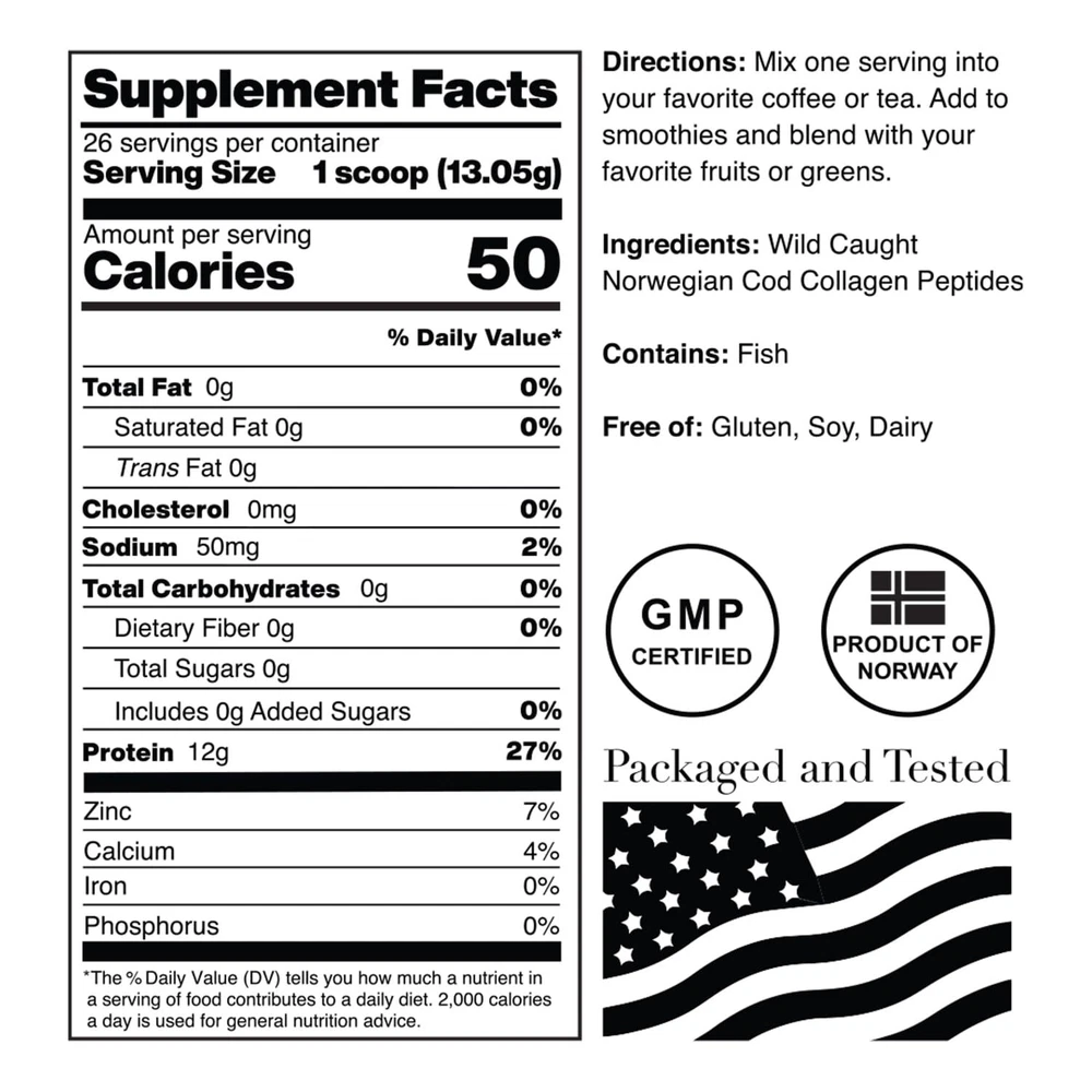 Supports Healthy Bones, Skin, Hair, Nail, Joint and Cartilage PREMIUM SOURCE: Extracted from Norwegian Wild Cod, our collagen offers superior quality. Single-ingredient formula ensures purity, and it's designed to mix instantly with your beverages. HIGH NUTRITIONAL PROFILE: Delivers 50 calories per serving, packed with 12G of protein, and completely free from fats, sugars, and carbs. Ideal for those monitoring their dietary intake. MULTIPLE BENEFITS: A daily dose supports healthy bones, radiant skin, robust hair and nails, and promotes joint and cartilage . A natural way to enhance overall vitality. QUALITY ASSURED: Packed and rigorously tested in USA GMP-certified facilities, guaranteeing a premium product that meets strict quality and safety standards. SUSTAINABLE & PURE: Our collagen is sourced using sustainable fishing practices from wild cod, not farm-raised, ensuring minimal environmental impact. Also, our product boasts low metal levels for added purity.