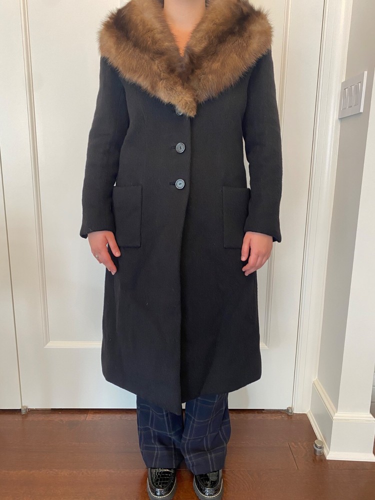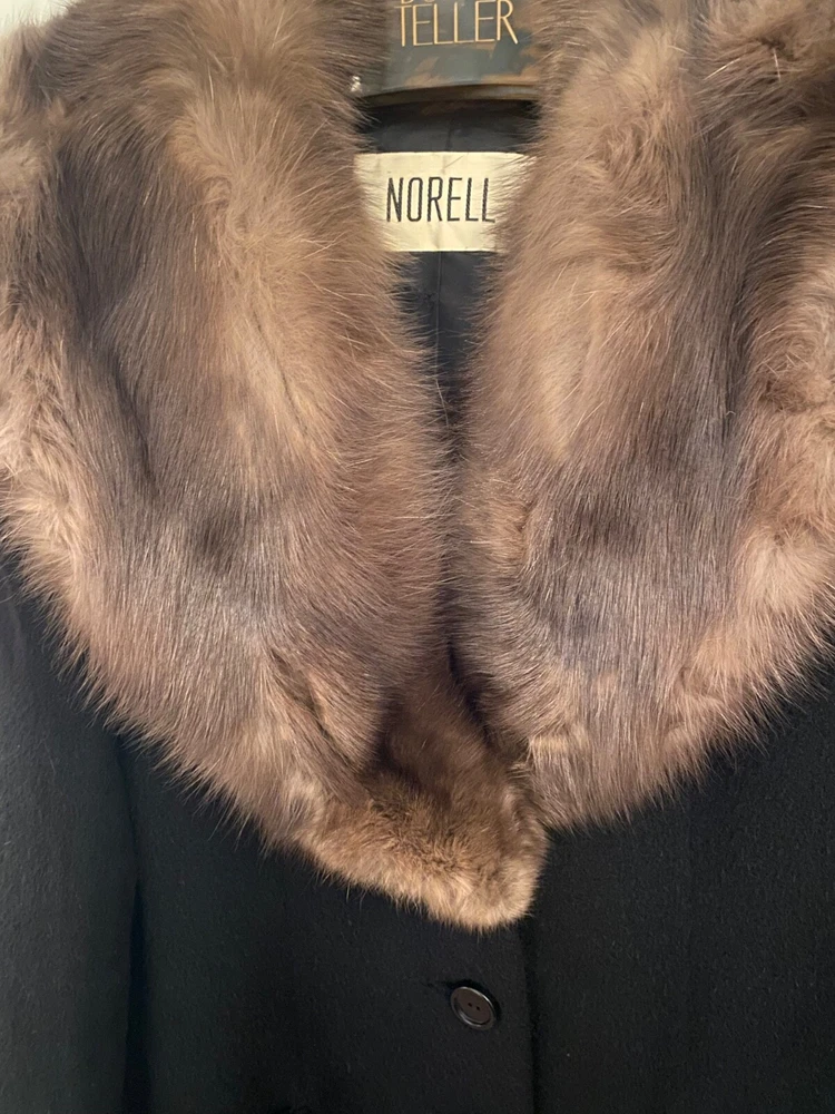 Embrace timeless elegance with this Norell women's wool coat, a classic addition to your outerwear collection. The coat features a luxurious mink collar that adds a touch of sophistication to the overall design. Tailored for a regular fit and crafted from high-quality wool, this long coat ensures both comfort and durability.In a sleek black color, it's a versatile piece that complements any outfit, making it ideal for both formal and casual occasions. The silk lining offers an extra layer of warmth and softness, ensuring you're cozy during cooler seasons. With its vintage charm and stylish collared feature, this coat is a must-have for those who appreciate fashion with a rich history. Vintage from the 80s, great condition. Model is 5’ 4”