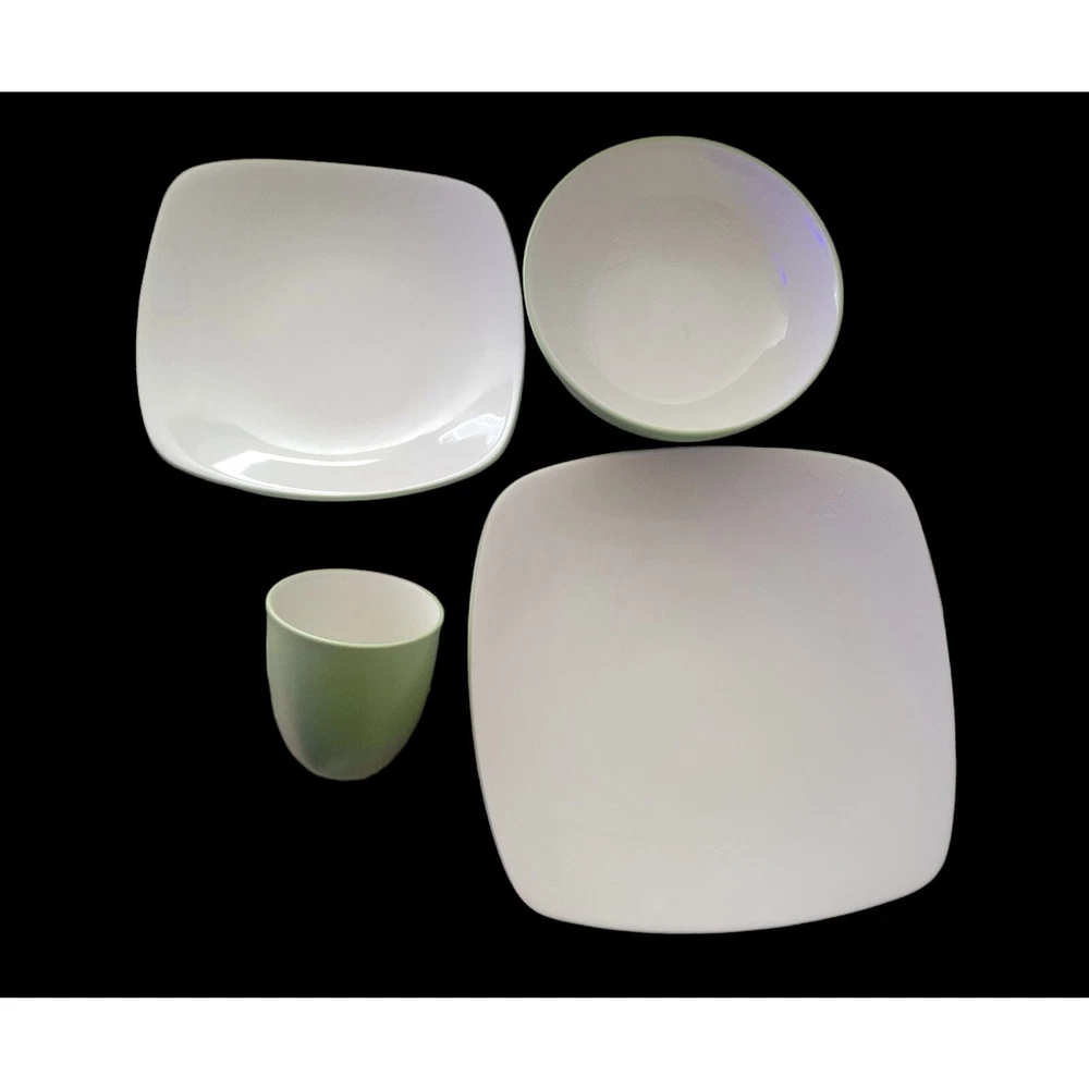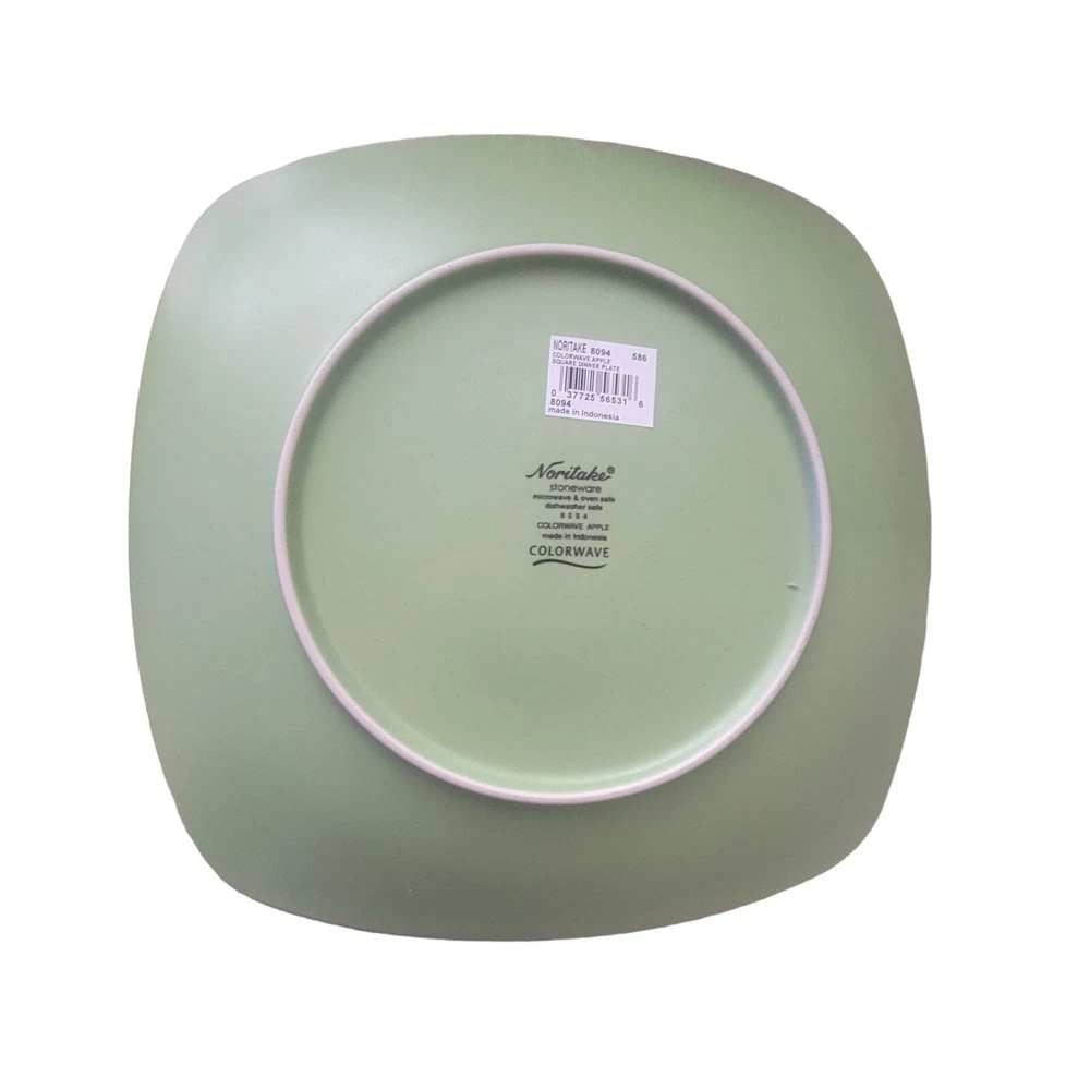 Noritake Colorwave Apple One Place Setting with 4 Pieces Plates are square with a wave. Colorwave collection has a matte-textured color on the outside. Glossy color on the inside. Green Color on the outside like granny green apples. Cream Color on the inside. 8094 The tag is still on the plates. Still being sold in upscale department stores. Square dinner plate about 10 7/8 inches Square salad plate about 8 1/2 Inches One bowl about 7 inches One cup about 4 inches high and 3 1/2 inches wide Microwave, Dishwasher, Oven Safe Made in Indonesia